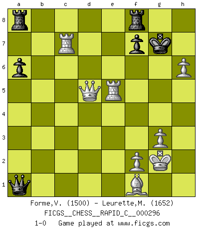 Last move : 1-0 2023 June 19 17:10:18 [Event "FICGS__CHESS__RAPID_C__000296"] [Site "FICGS"] [Date "2023.05.20"] [Round "1"] [White "Forme,Vocihc"] [Black "Leurette,Marc-Antoine"] [Result "1-0"] [WhiteElo "1500"] [BlackElo "1652"] 1.e4 e5 2.Nf3 Nc6 3.Bb5 Nf6 4.O-O Nxe4 5.Re1 Nd6 6.Nxe5 Nxe5 7.Rxe5+ Be7 8.Bf1 O-O 9.d4 b6 10.Nc3 Bb7 11.Nd5 Bxd5 12.Rxd5 c6 13.Re5 Bf6 14.Re1 b5 15.c3 a6 16.Bf4 Ne8 17.d5 Nc7 18.dxc6 d5 19.a4 bxa4 20.Rxa4 Ne6 21.Bg3 Qb6 22.Qxd5 Qxb2 23.Rc4 Bxc3 24.Re2 Qa3 25.c7 Nxc7 26.Bxc7 Qa1 27.g3 h6 28.Kg2 Bf6 29.h4 g5 30.Be5 Bxe5 31.Rxe5 Kg7 32.hxg5 Rh8 33.Rc7 Rhf8 34.gxh6+ 1-0 Follow this game move after move (download)Look at Garry Kasparov. After he loses, invariably he wins the next game. He just kills the next guy. That's something that we have to learn to be able to do. (Maurice Ashley) Deine Wertungszahl - vorausgesetzt einige Jahre schachliche Anstrengung - entspricht etwa dem zehnfachen Deines IQ plus 1000. (Jonathan Levitt) ¿Porque tengo que perder ante este idiota?. (Aron Nimzovich) Si le désir cupide (et stupide) de gagner est une inépuisable source de souffrance, une combinaison brillante sur l'échiquier est une découverte : le coquelicot qui s'épanouit lorsque apparaît la Voie Lactée. (Arrabal) Industry executives and analysts often mistakenly talk about strategy as if it were some kind of chess match. But in chess, you have just two opponents, each with identical resources, and with luck playing a minimal role. The real world is much more like a poker game, with multiple players trying to make the best of whatever hand fortune has dealt them. In our industry, Bill Gates owns the table until someone proves otherwise. (David Moschella, 'Computerworld')