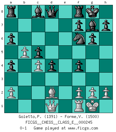 Last move : 0-1 2023 August 31 20:53:53 [Event "FICGS__CHESS__CLASS_E__000245"] [Site "FICGS"] [Date "2023.05.20"] [Round "1"] [White "Goletto,Piero Giuseppe"] [Black "Forme,Vocihc"] [Result "0-1"] [WhiteElo "1391"] [BlackElo "1500"] 1.e4 c5 2.Nf3 Nc6 3.Bb5 g6 4.O-O Bg7 5.Nc3 Nd4 6.Nxd4 Bxd4 7.Ne2 Bg7 8.d3 a6 9.Ba4 b5 10.c4 bxa4 11.b3 Bxa1 12.Bd2 Bg7 13.e5 d6 14.Nc3 dxe5 15.d4 exd4 16.Ne2 Nf6 17.Nf4 O-O 18.b4 e5 19.b5 exf4 0-1 This chess game has been lost on time (started : 2023.05.20 15:46:11) Follow this game move after move (download)Let the perfectionist play postal. (Yasser Seirawan) Man wirke der falschen Auffassung entgegen, als ob jeder Zug Unmittelbares zu leisten habe; auch Werte- und Ruhezüge haben ihre Existenzberechtigung. (Aaron Nimzowitsch) La vida es como un juego de Ajedrez, cambiando con cada movimiento. (Proverbio Chino) Roi des jeux et jeu des rois, les échecs portent en eux un sentiment d'infini. Ils donnent à celui qui s'est efforcé d'en approfondir les arcanes l'impression de n'être pas à la mesure de l'homme; en fait, ils constituent un résumé de l'univers, un microcosme, et figurent cette grande échelle qui, dans les plans de la lumière descend jusqu'à la matière, qui des abîmes insondables remonte jusqu'en l'infini de Dieu. (Pyrame) You must have a dream in order to have it come true. (A.P.J. Kalam)