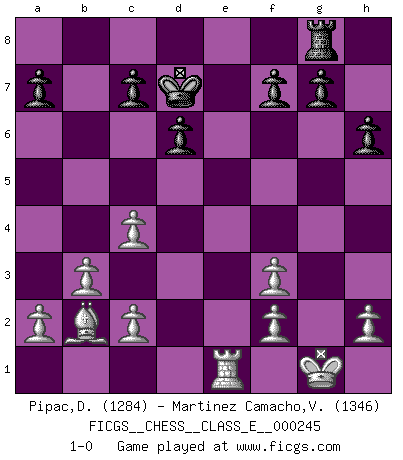 Last move : 1-0 2023 August 31 18:2:17 [Event "FICGS__CHESS__CLASS_E__000245"] [Site "FICGS"] [Date "2023.05.20"] [Round "1"] [White "Pipac,Darko"] [Black "Martinez Camacho,Victor Hugo"] [Result "1-0"] [WhiteElo "1284"] [BlackElo "1346"] 1.e4 e5 2.Nf3 Nf6 3.Nc3 Nc6 4.Bb5 Bb4 5.Bxc6 bxc6 6.Nxe5 Bxc3 7.dxc3 Nxe4 8.Qe2 Qe7 9.Qxe4 d6 10.Qxc6+ Kd8 11.O-O Rb8 12.Nf3 Bb7 13.Qb5 Qd7 14.Qxd7+ Kxd7 15.b3 h6 16.Bb2 Bxf3 17.gxf3 Rbe8 18.c4 Rhg8 19.Rfe1 Rxe1+ 20.Rxe1 1-0 Follow this game move after move (download)Human affairs are like a Chess game: only those who do not take it seriously can be called good players. (Hung Tzu Ch'eng) Ein Teil des Fehlers ist immer korrekt. (Savielly Grigorievitsch Tartakower) La vida es como el Ajedrez, con lucha, competición y eventos buenos y malos. (Benjamin Franklin) Donnez-moi un Cavalier en 6e et je gagnerais toutes mes parties. (Steinitz) A generalist learns less and less about more and more until he knows nothing about everything. (Author unknown)
