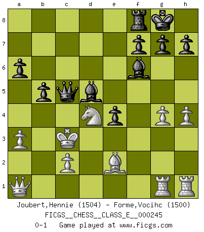 Last move : 0-1 2023 August 2 11:34:42 [Event "FICGS__CHESS__CLASS_E__000245"] [Site "FICGS"] [Date "2023.05.20"] [Round "1"] [White "Joubert,Hennie"] [Black "Forme,Vocihc"] [Result "0-1"] [WhiteElo "1504"] [BlackElo "1500"] 1.e4 c5 2.Nf3 d6 3.d4 cxd4 4.Nxd4 Nf6 5.Nc3 a6 6.Be3 e5 7.Nb3 Be7 8.Be2 Be6 9.f3 Nbd7 10.Qd2 Rc8 11.O-O-O b5 12.a3 Nb6 13.g4 Nc4 14.Qd3 Nxg4 15.fxg4 Nxe3 16.Rdg1 Bg5 17.Kb1 Bc4 18.Qd2 Nd5 19.Qd1 Nxc3+ 20.bxc3 O-O 21.Kb2 d5 22.exd5 Bxd5 23.h4 Be7 24.Bf3 e4 25.Be2 Qd6 26.Qa1 Rxc3 27.Kxc3 Bf6+ 28.Nd4 Qc5+ 0-1 Follow this game move after move (download)Do you realize Fischer almost never has any bad pieces? He exchanges them, and the bad pieces remain with his opponents. (Yuri Balashov) Die Elozahlen sind sehr schlecht für das Schach. Jetzt ist Schach eine Sportindustrie, die darauf zielt Elopunkte zu machen. (Miguel Najdorf) La batalla por la última verdad nunca sera ganada. Y es por eso que el Ajedrez es tan fascinante. (Hans Kmoch) Les Cavaliers se révèlent fort utiles dans les positions fermées. D'habitude, les Fous sont un peu plus forts que les Cavaliers dans les positions ouvertes. Qu'on le veuille ou non, il restera toujours des exceptions ! For a mechanic, you seem to do an excessive amount of thinking. (C-3PO in Star Wars ep.2)