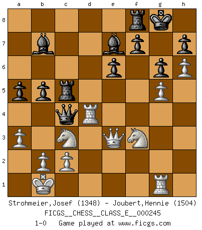 Last move : 1-0 2023 August 2 11:36:2 [Event "FICGS__CHESS__CLASS_E__000245"] [Site "FICGS"] [Date "2023.05.20"] [Round "1"] [White "Strohmeier,Josef"] [Black "Joubert,Hennie"] [Result "1-0"] [WhiteElo "1348"] [BlackElo "1504"] 1.e4 c5 2.Nf3 e6 3.d4 cxd4 4.Nxd4 Nf6 5.Nc3 Qb6 6.Nb3 Nc6 7.Be3 Qc7 8.a3 a6 9.Qd2 d6 10.O-O-O b5 11.Nd4 Bb7 12.f3 Be7 13.Kb1 O-O 14.h4 Rac8 15.h5 Ne5 16.h6 g6 17.Qf2 Nc4 18.Bxc4 Qxc4 19.g4 d5 20.Qe2 dxe4 21.g5 exf3 22.Qd2 Ng4 23.Rhg1 Nxe3 24.Qxe3 Rc5 25.Nxf3 a5 26.Rd4 1-0 Follow this game move after move (download)In order to improve your game, you must study the endgame before everything else, for whereas the endings can be studied and mastered by themselves, the middle game and the opening must be studied in relation to the endgame. (Jose Raul Capablanca) Lisa Lane, amerikanische Schachmeisterin, hatte Fischer einmal als stärksten lebenden Spieler bezeichnet. Antwort: Das ist richtig, aber Lisa Lane ist eigentlich nicht in der Lage, das zu beurteilen. (Robert James Fischer) De todos mis libros Rusos, la defensa contiene y difunde el 'calor' mas grande que pudiese verse extraño al observar lo supremamente abstracto que el Ajedrez supuestamente es. (Vladimir Nabokov) Il (Jacob Murray) ne joue pas pour le bon coup, mais pour le meilleur. (Eloi Relange) Over-the-board chess is the favorite of mortals, correspondence chess is the favorite of the gods. (Eduard Dyckhoff)