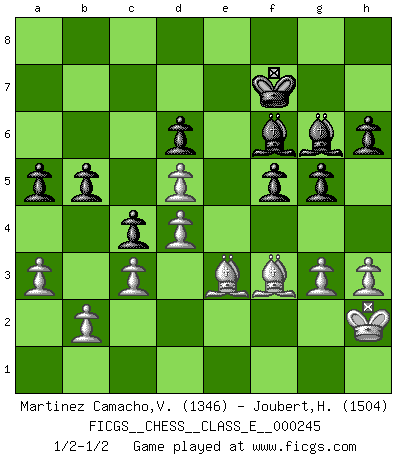 Last move : 1/2-1/2 2023 October 18 18:15:57 [Event "FICGS__CHESS__CLASS_E__000245"] [Site "FICGS"] [Date "2023.05.20"] [Round "1"] [White "Martinez Camacho,Victor Hugo"] [Black "Joubert,Hennie"] [Result "1/2-1/2"] [WhiteElo "1346"] [BlackElo "1504"] 1.e4 c5 2.Nc3 Nc6 3.g3 e6 4.Bg2 Nf6 5.Nge2 d6 6.d3 a6 7.O-O Be7 8.h3 O-O 9.Be3 Bd7 10.Qd2 Rc8 11.Rad1 b5 12.a3 Qc7 13.Kh2 Rfe8 14.f4 e5 15.fxe5 Nxe5 16.Nd5 Nxd5 17.exd5 c4 18.d4 Ng6 19.c3 f5 20.Nf4 Nxf4 21.Bxf4 h6 22.Rde1 Bf6 23.Rxe8+ Rxe8 24.Re1 g5 25.Rxe8+ Bxe8 26.Be3 Qe7 27.Bf2 Bg6 28.Qe3 Qxe3 29.Bxe3 Kf7 30.Bf3 a5 1/2-1/2 Follow this game move after move (download)If you aren't afraid of Spassky, then I have removed the element of money. (Jim Slater) Wenn Du einsam bist, wenn Du Dich in der Welt wie ein Fremder fühlst, spiele Schach. Das wird Deinen Geist erheben und Dein Ratgeber im Kampf sein. (Aristoteles) La pasion por jugar al Ajedrez es una de las mas inexplicables en el mundo. (H.G. Wells) Je fais ceci parce que dans cinquante coups j'obtiendrai cela; je m'appelle Mikhail Moisevitch Botvinnik. (Botvinnik) Dave, my mind is going. I can feel it. (HAL 9000 in 2001, a space odyssey)