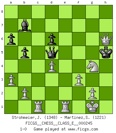 Last move : 1-0 2023 October 16 0:25:34 [Event "FICGS__CHESS__CLASS_E__000245"] [Site "FICGS"] [Date "2023.05.20"] [Round "1"] [White "Strohmeier,Josef"] [Black "Martinez,Silvio"] [Result "1-0"] [WhiteElo "1348"] [BlackElo "1221"] 1.e4 e5 2.Nf3 Nc6 3.Bb5 a6 4.Ba4 Nf6 5.O-O b5 6.Bb3 Bc5 7.c3 O-O 8.d4 exd4 9.cxd4 Bd6 10.e5 Ng4 11.exd6 cxd6 12.h3 Nf6 13.Bg5 h6 14.Bh4 g5 15.Bg3 d5 16.a3 Ne4 17.Bh2 Nf6 18.Nc3 Re8 19.Nxd5 Nxd5 20.Bxd5 Rb8 21.Bxb8 Nxb8 22.Ne5 Nc6 23.Bxf7+ Kg7 24.Bxe8 Qxe8 25.Re1 Bb7 26.Nxc6 Qg6 27.Ne5 Qe6 28.Rc1 Qd5 29.f3 d6 30.Ng4 h5 31.Nf2 g4 32.hxg4 hxg4 33.Nxg4 Kg6 34.Qd3+ Kg5 35.Qe3+ Kh5 36.Qh6+ 1-0 Follow this game move after move (download)In Chess, as it is played by masters, chance is practically eliminated. (Emanuel Lasker) Er war ein guter Schachspieler, aber ich kann Leute nicht ausstehen, die 'Heil Hitler' rufen (Über Alexander Aljechin). (Miguel Najdorf) Preferería tener un Peón que un dedo. (Reuben Fine) Aux échecs, l'amour-propre est satisfait quand on remporte la victoire, mais il n'y a pas de honte à être battu. (Benjamin Franklin) The problem with manipulation is that people can turn on you. (Horatio Caine, C.S.I. Miami)