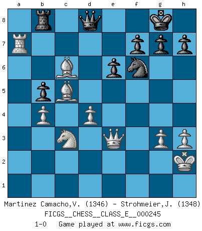 Last move : 1-0 2023 November 10 11:59:38 [Event "FICGS__CHESS__CLASS_E__000245"] [Site "FICGS"] [Date "2023.05.20"] [Round "1"] [White "Martinez Camacho,Victor Hugo"] [Black "Strohmeier,Josef"] [Result "1-0"] [WhiteElo "1346"] [BlackElo "1348"] 1.e4 c5 2.Nc3 Nc6 3.g3 e6 4.Bg2 d6 5.Nge2 Nf6 6.d3 Be7 7.O-O O-O 8.h3 a6 9.a3 Rb8 10.Be3 Qc7 11.Qd2 Bd7 12.Kh2 b5 13.f4 b4 14.axb4 Nxb4 15.Na4 Bb5 16.b3 Nd7 17.Nac3 Nf6 18.e5 dxe5 19.fxe5 Nd7 20.Ne4 Nc6 21.c4 Ndxe5 22.cxb5 axb5 23.Nxc5 Bxc5 24.Bxc5 Rfd8 25.d4 Ne7 26.b4 Nd7 27.Bxe7 Rdc8 28.Rfc1 Qb6 29.Rxc8+ Rxc8 30.Bc5 Qc7 31.Ra7 Qd8 32.Nc3 Rb8 33.Bc6 Nf6 34.Qe3 1-0 Follow this game move after move (download)Chess is like war on a board. (Bobby Fischer) Ich hatte Angst gegen einen russischen Großmeister zu verlieren, und er befürchtete gegen einen kleinen Jungen zu verlieren. (über ein Remis gegen Juri Awerbach). (Robert James Fischer) Bobby Fischer es el jugador de Ajedrez mas grande que jamás haya existido. (Ken Smith) C'est une question de caractère, Beaucoup de gens perdent leur motivation très vite. D'autres, ils sont rares, peuvent la conserver très longtemps. J'aime les échecs, encore aujourd'hui je suis heureux d'analyser des parties. J'aime toujours gagner, je déteste encore perdre. Bien jouer est important pour mon intégrité intellectuelle et morale. Et puis les échecs vivent en ce moment une période historique grâce à Internet. Ils se développent dans les systèmes éducatifs à travers le monde. Ils sortent de leur ghetto, et c'est mon rôle de mener à bien cette révolution. (Gary Kasparov) The next best thing to gambling and winning is gambling and loosing. (Nick Dandalos)