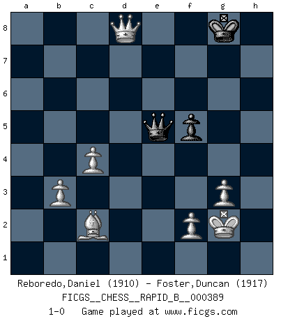 Last move : 1-0 2023 September 14 16:22:12 [Event "FICGS__CHESS__RAPID_B__000389"] [Site "FICGS"] [Date "2023.05.22"] [Round "1"] [White "Reboredo,Daniel"] [Black "Foster,Duncan"] [Result "1-0"] [WhiteElo "1910"] [BlackElo "1917"] 1.e4 c6 2.d4 d5 3.Nc3 dxe4 4.Nxe4 Nd7 5.Ng5 Ngf6 6.Bd3 e6 7.N1f3 Bd6 8.Qe2 h6 9.Ne4 Nxe4 10.Qxe4 Nf6 11.Qe2 Qb6 12.O-O O-O 13.b3 Qc7 14.c4 c5 15.Bb2 cxd4 16.Bxd4 b6 17.Rfe1 Bb7 18.Bc3 Bxf3 19.Qxf3 Bxh2+ 20.Kf1 Bf4 21.a4 Rad8 22.a5 Rd7 23.axb6 axb6 24.Bc2 Rfd8 25.g3 Bd2 26.Bxf6 gxf6 27.Qxf6 Bxe1 28.Qxh6 f5 29.Rxe1 Rd6 30.Rxe6 Rxe6 31.Qxe6+ Qf7 32.Qh6 Qg7 33.Qxb6 Qa1+ 34.Kg2 Qe5 35.Qxd8+ 1-0 Follow this game move after move (download)The essence of Chess is thinking about what Chess is. (David Bronstein) Ich habe Kasparov in Rente geschickt. (Veselin Topalov) La belleza de un movimiento no se refleja solo en su apariencia, sino en el pensamiento detrás de él. (Siegbert Tarrasch) Aidez vos pièces, elles vous aideront. (Paul Morphy) Unless I accept my faults I will most certainly doubt my virtues. (Hugh Prather)