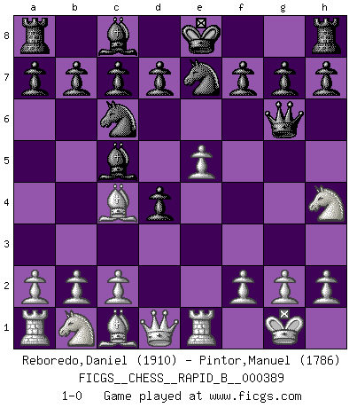 Last move : 1-0 2023 May 30 3:41:37 [Event "FICGS__CHESS__RAPID_B__000389"] [Site "FICGS"] [Date "2023.05.22"] [Round "1"] [White "Reboredo,Daniel"] [Black "Pintor,Manuel"] [Result "1-0"] [WhiteElo "1910"] [BlackElo "1786"] 1.e4 e5 2.Nf3 Nc6 3.d4 exd4 4.Bc4 Qf6 5.O-O Bc5 6.e5 Qg6 7.Re1 Nge7 8.Nh4 1-0 Follow this game move after move (download)When you play Bobby, it is not a question if you win or lose. It is a question if you survive. (Boris Spassky) Wenn Capablanka heute auf der Schachbühne erscheinen würde, hätte er ein halbes Jahr gebraucht um sich die Schachtheorie anzueignen. Und dann hätte er alles und jeden besiegt. (Mikhail Moiseyevich Botvinik) Hay dos clases de hombres: aquellos que se conforman en dejarse llevar por las circunstancias y que juegan barajas y aquellos decididos a controlar las circunstancias y que juegan al Ajedrez. (Mortimer Collins) Il (Jacob Murray) ne joue pas pour le bon coup, mais pour le meilleur. (Eloi Relange) A person who never made a mistake never tried anything new. (Albert Einstein)