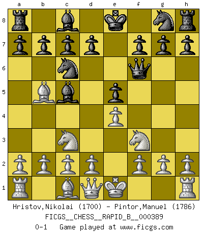 Last move : 0-1 2023 June 25 10:18:46 [Event "FICGS__CHESS__RAPID_B__000389"] [Site "FICGS"] [Date "2023.05.22"] [Round "1"] [White "Hristov,Nikolai"] [Black "Pintor,Manuel"] [Result "0-1"] [WhiteElo "1700"] [BlackElo "1786"] 1.e4 e5 2.Nf3 Nc6 3.Bb5 Qf6 4.Nc3 Bc5 0-1 This chess game has been lost on time (started : 2023.05.22 0:34:7) Follow this game move after move (download)I give 98 percent of my mental energy to Chess. Others give only 2 percent. (Bobby Fischer) Was ist der Unterschied zwischen einem Strassenarbeiter und einem Schachspieler? --Der Schachspieler bewegt sich ab und zu. (Anonymous) El Ajedrez por encima de todo... ¡es una pelea!. (Emanuel Lasker) Je ne suis pas le dernier à jouer lâchement des coups douteux pendant le zeïtnot de l'adversaire pour l'achever: en effet les coups qui font le plus peur sont ceux que l'on ne comprend pas. Je me fais souvent peur quand je joue. (Un professeur anonyme) Chess is everything: art, science and sport. (Anatoly Karpov)