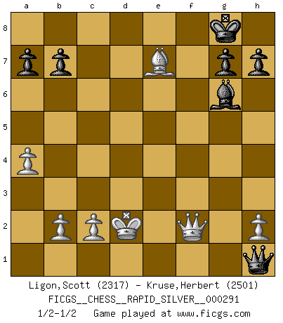 Last move : 1/2-1/2 2023 June 1 20:23:18 [Event "FICGS__CHESS__RAPID_SILVER__000291"] [Site "FICGS"] [Date "2023.05.22"] [Round "2"] [White "Ligon,Scott"] [Black "Kruse,Herbert"] [Result "1/2-1/2"] [WhiteElo "2317"] [BlackElo "2501"] 1.e4 e5 2.f4 exf4 3.Bc4 Qh4+ 4.Kf1 Nf6 5.Nf3 Qh6 6.Nc3 d6 7.d4 Be7 8.Kg1 O-O 9.g3 Nh5 10.Nd5 Nc6 11.Nxc7 Bg4 12.Nxa8 d5 13.Bxd5 Nxd4 14.Qxd4 Bxf3 15.Qf2 Bc5 16.Qxc5 Nxg3 17.Qf2 Qh5 18.Bxf4 Nxh1 19.Qe3 Qg4+ 20.Kf1 Rxa8 21.Ke1 Qg2 22.a4 Re8 23.Ra3 Bxe4 24.Rc3 Nf2 25.Bxf7+ Kxf7 26.Qxf2 Qh1+ 27.Kd2 Rd8+ 28.Rd3 Bxd3 29.Bg5 Kg8 30.Bxd8 Bg6 31.Be7 Qd5+ 32.Kc1 Qh1+ 33.Kd2 1/2-1/2 Follow this game move after move (download)Everything is in a state of flux, and this includes the world of Chess. (Mikhail Botvinnik) Die starken Figuren des Gegners muss man abtauschen. (José Raúl Capablanca) El Ajedrez, como la música, como el amor, tiene el poder de hacer feliz a la gente. (Siegbert Tarrasch) Tout change constamment, y compris dans le monde des Echecs. (Botvinnik) There is no instance of a country having benefited from prolonged warfare. (Sun Tzu)