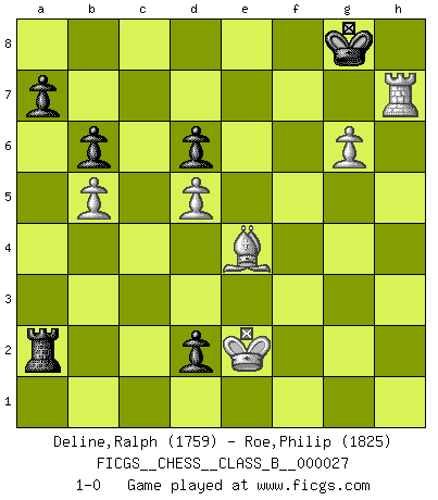 Last move : 1-0 2007 October 12 3:51:29 [Event "FICGS__CHESS__CLASS_B__000027"] [Site "FICGS"] [Date "2007.09.01"] [Round "1"] [White "Deline,Ralph"] [Black "Roe,Philip"] [Result "1-0"] [WhiteElo "1759"] [BlackElo "1825"] 1.c4 g6 2.d4 Bg7 3.e4 d6 4.Nf3 Bg4 5.Be2 Nc6 6.Be3 Bxf3 7.Bxf3 e5 8.d5 Nd4 9.Nd2 c5 10.O-O Ne7 11.Nb3 O-O 12.Nxd4 cxd4 13.Bd2 f5 14.Qe2 fxe4 15.Bxe4 Nf5 16.b4 Qe7 17.Rac1 Rac8 18.Qd3 b6 19.a3 Rc7 20.g3 Kh8 21.g4 Nh4 22.f4 Rfc8 23.fxe5 Bxe5 24.b5 Qg7 25.Bg5 Nf5 26.gxf5 gxf5 27.Rxf5 Bf4 28.Rxf4 Qxg5+ 29.Qg3 Qxg3+ 30.hxg3 Rxc4 31.Rxc4 Rxc4 32.Rh4 Ra4 33.Rxh7+ Kg8 34.Kf2 Rxa3 35.g4 Ra5 36.g5 Ra2+ 37.Kf3 d3 38.g6 d2 39.Ke2 1-0 English Opening Kingside Castling by player White (move 10) Kingside Castling by player Black (move 11) Player White won this chess game. Follow this game move after move (download)Fischer sacrificed virtually everything most of us weakies (to use his term) value, respect, and cherish, for the sake of an artful, often beautiful board game, for the ambivalent privilege of being its greatest master. (Paul Kollar) Wie gewinnt Tal? Er entwickelt alle seine Figuren in die Brettmitte und opfert sie dann irgendwo. (Robert James Fischer) No volvere nunca a jugar contigo. Has insultado a mi amigo. - cuando un oponente se maldijo por una mala jugada (Miguel Najdorf) La vie est comme un jeu d'échecs : nous esquissons un plan, mais celui-ci est tributaire de ce que daignent faire l'adversaire aux échecs et le destin dans la vie. (Arthur Schopenhauer) In every real man a child is hidden that wants to play. (Friedrich Nietzsche)