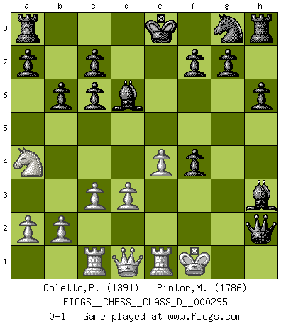 Last move : 0-1 2023 August 7 23:43:35 [Event "FICGS__CHESS__CLASS_D__000295"] [Site "FICGS"] [Date "2023.05.26"] [Round "1"] [White "Goletto,Piero Giuseppe"] [Black "Pintor,Manuel"] [Result "0-1"] [WhiteElo "1391"] [BlackElo "1786"] 1.e4 e5 2.Nf3 Nc6 3.Bb5 Bc5 4.O-O Qf6 5.Bxc6 dxc6 6.Nc3 Bg4 7.h3 Be6 8.d3 h6 9.Be3 Bb4 10.Na4 b6 11.c3 Bd6 12.Rc1 Qg6 13.Nh4 Qf6 14.f4 Qxh4 15.g3 Qxg3+ 16.Kh1 Qxe3 17.Re1 Qxh3+ 18.Kg1 exf4 19.Kf2 Qh2+ 20.Kf1 Bh3+ 0-1 Follow this game move after move (download)In blitz, the Knight is stronger than the Bishop. (Vlastimil Hort) Korrekt heißt in Deutschland die Haltung eines Mannes, dessen Benehmen nach dem Urteile seiner Nachbarn seiner Stellung angemessen ist. Um korrekt zu sein, muß man sich der Meinung der anderen anpassen... (Emanuel Lasker) El Ajedrez detiene a su maestro dentro de sus propios vínculos, encadenando la mente y el cerebro, por lo que la libertad interior del mas fuerte debe sufrir. (Albert Einstein) Des idées, des idées, j'en ai cent, j'en ai mille. Des bonnes, des mauvaises, applicables, irréalisables... Il suffit de faire le tri ! (Roos) I live to kill Traxler counterattack. (Ilmars Cirulis)