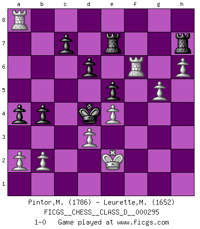 Last move : 1-0 2023 June 8 8:12:42 [Event "FICGS__CHESS__CLASS_D__000295"] [Site "FICGS"] [Date "2023.05.26"] [Round "1"] [White "Pintor,Manuel"] [Black "Leurette,Marc-Antoine"] [Result "1-0"] [WhiteElo "1786"] [BlackElo "1652"] 1.e4 e5 2.f4 d6 3.Nf3 Nc6 4.Bc4 Qe7 5.O-O Be6 6.Bxe6 Qxe6 7.Ng5 Qg6 8.d3 Be7 9.f5 Qf6 10.Qg4 Nd4 11.Na3 O-O-O 12.c3 h6 13.Qh5 g6 14.fxg6 hxg5 15.Qg4+ Qe6 16.Qxe6+ fxe6 17.cxd4 Nh6 18.Rf3 Rhg8 19.Rg3 Rxg6 20.h4 Nf7 21.Bd2 Rdg8 22.Rf1 R8g7 23.h5 Rh6 24.Rh3 Rgh7 25.g4 exd4 26.Nb5 Kb8 27.Nxd4 e5 28.Nf5 Re6 29.Nxe7 Rxe7 30.Rf5 b6 31.Bxg5 Nxg5 32.Rxg5 Re8 33.Rf3 Kb7 34.Rf6 R8e7 35.R5g6 a5 36.Kg2 Kc6 37.h6 Kc5 38.Kf3 Kd4 39.Ke2 b5 40.g5 b4 41.Rg8 a4 42.Ra8 1-0 Follow this game move after move (download)Do you realize Fischer almost never has any bad pieces? He exchanges them, and the bad pieces remain with his opponents. (Yuri Balashov) Obwohl ich alt bin, darf mir niemand den Finger in den Mund stecken, sonst beisse ich. (Wilhelm Steinitz) El estómago es una parte esencial del maestro de Ajedrez. (Bent Larsen) Toutes choses étant égales, c'est la conviction qui gagne. Alliée à une volonté de vaincre, elle sert de détonateur, suscite des idées, disperse les doutes et aide à penser clairement. (Robert Fischer) I find television to be very educating. Every time somebody turns on the set, I go in the other room and read a book. (Groucho Marx)