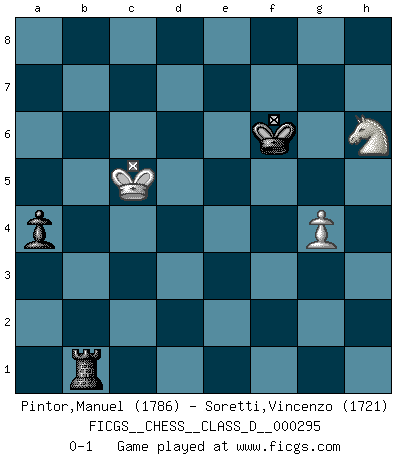 Last move : 0-1 2023 July 10 12:2:40 [Event "FICGS__CHESS__CLASS_D__000295"] [Site "FICGS"] [Date "2023.05.26"] [Round "1"] [White "Pintor,Manuel"] [Black "Soretti,Vincenzo"] [Result "0-1"] [WhiteElo "1786"] [BlackElo "1721"] 1.e4 c5 2.f4 d6 3.Nf3 Nf6 4.Nc3 g6 5.Bc4 Bg7 6.O-O O-O 7.d3 a6 8.a4 Nc6 9.h3 Be6 10.Bxe6 fxe6 11.Ng5 Qd7 12.Ne2 b5 13.c3 b4 14.Qb3 Nd8 15.g4 h6 16.Nf3 Kh8 17.Nh4 Kh7 18.f5 exf5 19.exf5 gxf5 20.Nxf5 a5 21.Qc2 e6 22.Nxg7 Qxg7 23.Ng3 Nc6 24.Qg2 Rac8 25.Bd2 Rg8 26.Rae1 Rce8 27.Qxc6 Qe7 28.Bf4 e5 29.Kh2 Nxg4+ 30.hxg4 Qh4+ 31.Kg2 exf4 32.Qd7+ Kh8 33.Rxf4 Rxe1 34.Qf5 Qg5 35.Qf7 Re7 36.Qc4 bxc3 37.Qxc3+ Qe5 38.Qxe5+ Rxe5 39.Kf3 Rge8 40.Nf5 R8e6 41.Re4 Rxe4 42.dxe4 Kh7 43.Kf4 Kg6 44.Ne3 Re7 45.Nc4 Rb7 46.Nxd6 Rxb2 47.Ke5 Rb4 48.Kd5 Rxa4 49.Kxc5 Ra1 50.e5 a4 51.e6 Kf6 52.e7 Kxe7 53.Nf5+ Kf6 54.Nxh6 Rb1 0-1 Follow this game move after move (download)Pawns are born free, yet they are everywhere in chains. (Rick Kennedy) Im Schach gibt es keinen Platz für Galanterie. (Irving Chernev) Aquellos que dicen entender al Ajedrez, no entienden nada. (Robert Hubner) J'ai vu le vaincu d'Echecs jouer des années durant dans l'espoir de la fête de la victoire. Car tu es plus riche de ce qu'elle existe si même elle n'est point pour toi. Ainsi de la perle du fond des mers. (Antoine de Saint-Exupéry) Creativity involves breaking out of established patterns in order to look at things in a different way. (Edward De Bono)