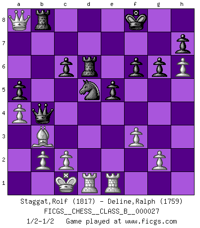 Last move : 1/2-1/2 2008 January 1 17:24:54 [Event "FICGS__CHESS__CLASS_B__000027"] [Site "FICGS"] [Date "2007.09.01"] [Round "1"] [White "Staggat,Rolf"] [Black "Deline,Ralph"] [Result "1/2-1/2"] [WhiteElo "1817"] [BlackElo "1759"] 1.e4 c5 2.Nf3 d6 3.d4 cxd4 4.Nxd4 Nf6 5.Nc3 g6 6.Be3 Bg7 7.f3 O-O 8.Qd2 Nc6 9.O-O-O d5 10.exd5 Nxd5 11.Nxc6 bxc6 12.Bd4 Bxd4 13.Qxd4 Qc7 14.Bc4 e5 15.Qd2 Be6 16.Ne4 Rad8 17.Nc5 Rfe8 18.Rhe1 Qb6 19.Nxe6 Rxe6 20.h4 Red6 21.Qg5 Rb8 22.Bb3 a5 23.a4 f6 24.Qe3 Qb4 25.Qe4 Qc5 26.Qe3 Qb4 27.h5 Kg7 28.h6+ Kf8 29.Qa7 Rb7 30.Qa8+ Rb8 1/2-1/2 Sicilian : Dragon, Yugoslav attack, 7...O-O Kingside Castling by player Black (move 7) Queenside Castling by player White (move 9) This chess game ended in a draw. Follow this game move after move (download)Bobby is the finest Chess player this country ever produced. His memory for the moves, his brilliance in dreaming up combinations, and his fierce determination to win are uncanny. (John Collins) Schon mancher Spieler hat aufgegeben, um zu vermeiden, daß er eine Figur verliert. (Savielly Grigorievitsch Tartakower) Sin errores no puede haber brillantez. (Emanuel Lasker) Les erreurs sont comme les malheurs, elles n'arrivent jamais seules. (Siegbert Tarrasch) Don't be irreplaceable, if you can't be replaced, you can't be promoted. (Dan Rotaru)