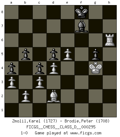 Last move : 1-0 2023 December 11 1:56:13 [Event "FICGS__CHESS__CLASS_D__000295"] [Site "FICGS"] [Date "2023.05.26"] [Round "1"] [White "Zmolil,Karel"] [Black "Brodie,Peter"] [Result "1-0"] [WhiteElo "1727"] [BlackElo "1708"] 1.e4 e6 2.f4 d5 3.e5 Nc6 4.d4 Be7 5.Nf3 Nh6 6.a3 O-O 7.Bd3 Nf5 8.c3 Bd7 9.O-O a5 10.Qe2 f6 11.g3 Qe8 12.Nbd2 fxe5 13.Nxe5 Nxe5 14.fxe5 g6 15.Nf3 b5 16.Bd2 Kh8 17.Qg2 c5 18.Qh3 c4 19.Bc2 Qf7 20.g4 Ng7 21.Nh4 Nf5 22.gxf5 exf5 23.Bh6 Rg8 24.Bd2 Ra6 25.Rae1 Bxh4 26.Qxh4 Re6 27.Qg5 Qe7 28.Rf3 Qxg5+ 29.Bxg5 Kg7 30.h4 h6 31.Bd2 Be8 32.Kf2 Rf8 33.Rg1 Kh7 34.h5 g5 35.Bxf5+ Rxf5 36.Rxf5 Bxh5 37.Rh1 Kg6 38.Rf8 Kg7 39.Rd8 Re8 40.Rxe8 Bxe8 41.Kg3 Bf7 42.Rf1 a4 43.Rf6 Bh5 44.Rd6 Bf7 45.Kg4 Bg8 46.Kh5 Bf7+ 47.Kg4 Kf8 48.Rxh6 1-0 Follow this game move after move (download)Pawns: they are the soul of this game, they alone form the attack and defense. (Philidor) Stil? Ich habe keinen Stil! (Anatoly Karpov) Un buen sacrificio es aquel que aunque no sea necesariamente sólido, deja a tu oponente aturdido y confuso. (Rudolph Spielmann) La tactique est l'élément le plus important du milieu de jeu. (Siegbert Tarrasch) What doesn't kill us makes us stronger. (Friedrich Nietzsche)