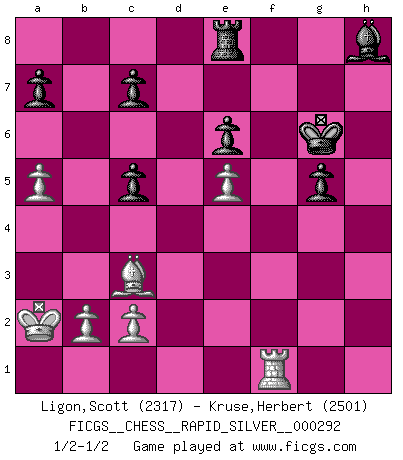 Last move : 1/2-1/2 2023 June 5 4:7:34 [Event "FICGS__CHESS__RAPID_SILVER__000292"] [Site "FICGS"] [Date "2023.05.26"] [Round "2"] [White "Ligon,Scott"] [Black "Kruse,Herbert"] [Result "1/2-1/2"] [WhiteElo "2317"] [BlackElo "2501"] 1.e4 e5 2.f4 exf4 3.Bc4 Nc6 4.Nf3 g5 5.d4 Bg7 6.h4 h6 7.Nc3 d6 8.Qd3 Bg4 9.Bb5 Kf8 10.Bxc6 bxc6 11.Bd2 Ne7 12.O-O-O Ng6 13.Ne2 Bxf3 14.Qxf3 Nxh4 15.Rxh4 gxh4 16.Nxf4 Qf6 17.Kb1 Kg8 18.Bc3 Rb8 19.g3 hxg3 20.Qxg3 Kh7 21.Nh5 Qg6 22.Qh2 Rhg8 23.Rh1 Rbe8 24.e5 dxe5 25.dxe5 Bh8 26.a4 c5 27.Rf1 Re7 28.Qh4 Re6 29.a5 Rge8 30.Nf4 Qg5 31.Qxg5 hxg5 32.Nxe6 fxe6 33.Ka2 Kg6 1/2-1/2 Follow this game move after move (download)Chess is a more highly symbolic game, but the aggressions are therefore even more frankly represented in the play. It probably began as a war game; that is, the representation of a miniature battle between the forces of two kingdoms. (Karl Meninger) Frage: Was machen Sie mit den Preisen? Anwort: Ich habe Angst, dass meine Freundin davon neue Kleider kauft. (Loek van Wely) Uno por uno, yo los acribillé, mi superioridad muy pronto se volvio aparente. (Jose Capablanca) Vouloir jouer aux échecs contre soi-même est aussi paradoxal que vouloir marcher sur son ombre. (Stefan Zweig) A clear conscience is usually the sign of a bad memory. (Unknown)