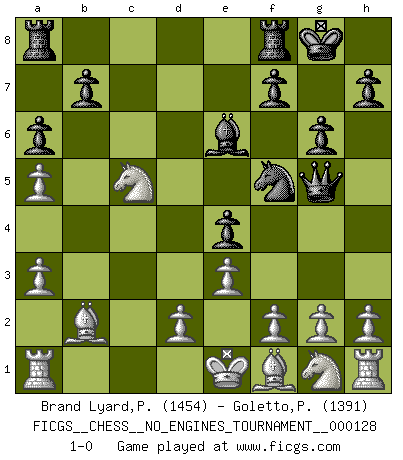 Last move : 1-0 2023 August 30 17:54:51 [Event "FICGS__CHESS__NO_ENGINES_TOURNAMENT__000128"] [Site "FICGS"] [Date "2023.05.27"] [Round "1"] [White "Brand Lyard,Paul"] [Black "Goletto,Piero Giuseppe"] [Result "1-0"] [WhiteElo "1454"] [BlackElo "1391"] 1.c4 e5 2.Nc3 Nf6 3.b3 Nc6 4.e3 Bb4 5.a3 Ba5 6.b4 O-O 7.bxa5 d6 8.Nb5 a6 9.Nc3 d5 10.cxd5 Nxd5 11.Nxd5 Be6 12.Nb4 Ne7 13.Qh5 g6 14.Qh6 Nf5 15.Qg5 Qxg5 16.Bb2 c5 17.Nd3 e4 18.Nxc5 1-0 This chess game has been lost on time (started : 2023.05.27 18:43:7) Follow this game move after move (download)Chess demands total concentration. (Bobby Fischer) Computer sind die einzigen Gegner, die nicht immer eine Ausrede auf Lager haben, wenn sie gegen mich verlieren. (Robert James Fischer) La última cosa en que Fischer estaba interesado era en tonterías, siempre y cuando el Ajedrez estuviera involucrado. (Elie Agur) Les échecs, c'est l'art d'analyser. (Mikhail Botvinnik) Life is like a ten-speed bicycle: most of us have gears we never use. (Charles M. Schulz)