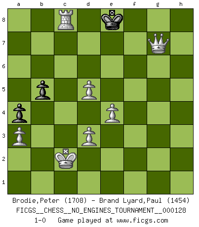 Last move : 1-0 2024 January 29 22:14:12 [Event "FICGS__CHESS__NO_ENGINES_TOURNAMENT__000128"] [Site "FICGS"] [Date "2023.05.27"] [Round "1"] [White "Brodie,Peter"] [Black "Brand Lyard,Paul"] [Result "1-0"] [WhiteElo "1708"] [BlackElo "1454"] 1.e4 e5 2.f4 d6 3.Nf3 Bg4 4.Be2 Bxf3 5.Bxf3 Qh4+ 6.g3 Qh3 7.d4 exf4 8.Bxf4 h5 9.Qe2 Nc6 10.Qc4 h4 11.Qf1 Qxf1+ 12.Rxf1 hxg3 13.d5 Nce7 14.Bxg3 a5 15.Nc3 Rh3 16.Bg4 Rh6 17.O-O-O Nf6 18.Bf3 g5 19.Rh1 g4 20.Be2 Bg7 21.Nb5 Kd8 22.Bd3 b6 23.Bf4 Rh3 24.Bg3 Bh6+ 25.Kb1 Be3 26.Rde1 Bd2 27.Re2 Bb4 28.Rf1 Rh6 29.Bf4 Rh3 30.Bg3 a4 31.a3 Bxa3 32.bxa3 Rh6 33.Bf4 Rh4 34.Bg5 Rh3 35.Bxf6 Rb8 36.Bxe7+ Kxe7 37.Ref2 Rf8 38.Nxc7 Rxd3 39.cxd3 Rh8 40.Nb5 Kd7 41.Rxf7+ Ke8 42.Nxd6+ Kd8 43.Rf8+ Rxf8 44.Rxf8+ Ke7 45.Rg8 Kxd6 46.Rxg4 b5 47.h4 Ke5 48.h5 Kd4 49.Kc2 Ke3 50.h6 Kf3 51.Rg8 Ke3 52.h7 Kd4 53.h8Q+ Kc5 54.Rc8+ Kd6 55.Rc6+ Kd7 56.Qg7+ Ke8 57.Rc8+ 1-0 Follow this game move after move (download)As one by one I mowed them down, my superiority soon became apparent. (Jose Capablanca) Bis jetzt ist Weiß einer wohlbekannten Analyse gefolgt. Aber jetzt begeht er einen schrecklichen Fehler: Er beginnt seinen eigenen Kopf zu benutzen. (Siegbert Tarrasch) El Ajedrez es el arte del análisis. (Mikhail Botvinnik) Votre prénom est 'Tactique', votre deuxième prénom est 'Tactique' et votre nom est 'Tactique'. (Ken Smith) Men should grow up. - Yeah. And dogs should stop licking themselves. It's not gonna happen. (Gregory House to Dr. Cameron, House M.D.)