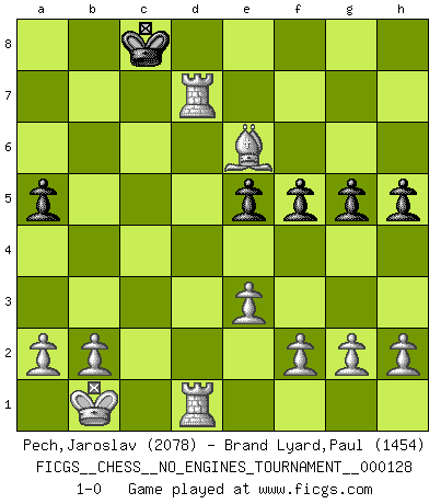 Last move : 1-0 2023 October 1 20:59:3 [Event "FICGS__CHESS__NO_ENGINES_TOURNAMENT__000128"] [Site "FICGS"] [Date "2023.05.27"] [Round "1"] [White "Pech,Jaroslav"] [Black "Brand Lyard,Paul"] [Result "1-0"] [WhiteElo "2078"] [BlackElo "1454"] 1.c4 e5 2.Nc3 f5 3.d4 d6 4.dxe5 dxe5 5.Qxd8+ Kxd8 6.Bg5+ Be7 7.O-O-O Nd7 8.Nf3 Bxg5+ 9.Nxg5 Ke8 10.Ne6 Ngf6 11.Nxc7+ Ke7 12.Nxa8 b6 13.e3 Ba6 14.Nc7 Bxc4 15.Bxc4 Rc8 16.N7d5+ Nxd5 17.Bxd5 h5 18.Kb1 g5 19.Bb3 a5 20.Nd5+ Kf7 21.Nxb6 Kf6 22.Rd6+ Ke7 23.Nxc8+ Ke8 24.Rhd1 Kd8 25.Rxd7+ Kxc8 26.Be6 1-0 Follow this game move after move (download)You have to have the fighting spirit. You have to force moves and take chances. (Bobby Fischer) Intelligenz läßt sich nicht am Weg, sondern nur am Ergebnis feststellen. (Garry Kasparov) ¡Examina movidas que hagan daño! Un buen ojo for movidas desvastantes es mucho mas importante que el conocimiento de principios estratégicos. (Purdy) Si rien de grave n'est détecté lors de l'analyse d'une position, on joue alors le coup. Seconde règle de Blumenfeld. If you work for a living, why do you kill yourself working ? (Tuco to a chicken in The Good, The Bad and The Ugly)