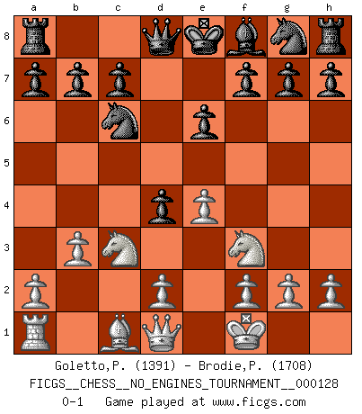 Last move : 0-1 2023 July 17 6:35:58 [Event "FICGS__CHESS__NO_ENGINES_TOURNAMENT__000128"] [Site "FICGS"] [Date "2023.05.27"] [Round "1"] [White "Goletto,Piero Giuseppe"] [Black "Brodie,Peter"] [Result "0-1"] [WhiteElo "1391"] [BlackElo "1708"] 1.e4 e6 2.Nf3 d5 3.Bb5+ Bd7 4.O-O Bxb5 5.c4 Bxc4 6.b3 Bxf1 7.Kxf1 Nc6 8.Nc3 d4 0-1 This chess game has been lost on time (started : 2023.05.27 18:43:7) Follow this game move after move (download)If I win a tournament, I win it by myself. I do the playing. Nobody helps me. (Bobby Fischer) Wenn ich einen Club besuche, sind die Spieler stumm vor Staunen. (José Raúl Capablanca) Los libros de Ajedrez deben de usarse igual como usamos los anteojos: para mejorar la vista, aunque algunos jugadores los quieren usar como si ellos les otorgaran la vision. (José Raúl Capablanca) A ce moment-là, je menaçais de comprendre la position ! (Clément L'Heureux) Be who you are, and say what you feel because those who mind don't matter, and those who matter don't mind. (Dr Seuss)