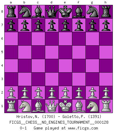 Last move : 0-1 2023 July 7 2:38:23 [Event "FICGS__CHESS__NO_ENGINES_TOURNAMENT__000128"] [Site "FICGS"] [Date "2023.05.27"] [Round "1"] [White "Hristov,Nikolai"] [Black "Goletto,Piero Giuseppe"] [Result "0-1"] [WhiteElo "1700"] [BlackElo "1391"] 0-1 This chess game has been lost on time (started : 2023.05.27 18:43:7) Follow this game move after move (download)When you are lonely, when you feel yourself an alien in the world, play Chess. This will raise your spirits and be your counselor in war. (Aristotle) Schach ist Leben. (Robert James Fischer) Es muy difícil jugar en contra de la teoría de Einstein. - en su primera derrota en contra de Fischer (Mikhail Tal) Plusieurs personnes se sont demandées comment Tal faisait pour gagner... En fait, c'est très simple ! Il met ses pièces au centre de l'échiquier et les sacrifie quelque part ! (David Bronstein) Vladimir Ras-Putin is still alive... He is also a good actor, I saw him in the Lord of the Rings. (Rodolfo d'Ettorre)