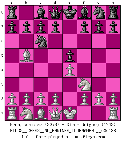 Last move : 1-0 2023 July 18 19:49:1 [Event "FICGS__CHESS__NO_ENGINES_TOURNAMENT__000128"] [Site "FICGS"] [Date "2023.05.27"] [Round "1"] [White "Pech,Jaroslav"] [Black "Dizer,Grigory"] [Result "1-0"] [WhiteElo "2078"] [BlackElo "1943"] 1.e4 e5 2.Nf3 Nc6 3.Bb5 1-0 This chess game has been lost on time (started : 2023.05.27 18:43:7) Follow this game move after move (download)Bobby is the most misunderstood, misquoted celebrity walking the face of this earth. (Yasser Seirawan) Am wohlsten fühle ich mich, wenn ich sehe, wie sich mein Gegner im Todeskampf windet. (Robert James Fischer) Las leyes del Ajedrez no permiten una libre elección: tienes que mover quieras o no. (Emanuel Lasker) Avant la finale, les dieux ont créé le milieu de partie. (Tarrasch) You lose, general Kenobi. (General Grievous in Star Wars ep.3)