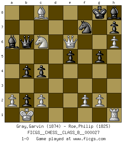 Last move : 1-0 2008 March 22 15:5:30 [Event "FICGS__CHESS__CLASS_B__000027"] [Site "FICGS"] [Date "2007.09.01"] [Round "1"] [White "Gray,Garvin"] [Black "Roe,Philip"] [Result "1-0"] [WhiteElo "1874"] [BlackElo "1825"] 1.e4 c6 2.d4 d5 3.Nc3 g6 4.Nf3 Bg7 5.e5 Nh6 6.Bf4 f6 7.Qd2 Nf7 8.exf6 exf6 9.O-O-O O-O 10.Re1 b5 11.h4 a5 12.Kb1 Nd7 13.Bd3 Nb6 14.h5 g5 15.h6 Bh8 16.Bg3 b4 17.Ne2 Nc4 18.Qc1 a4 19.Nd2 Ba6 20.Bf5 Re8 21.Qd1 a3 22.Nxc4 dxc4 23.d5 axb2 24.Nd4 cxd5 25.Nc6 Qb6 26.Rxe8+ Rxe8 27.Qxd5 Qb7 28.Bd6 Re5 29.Bxe5 fxe5 30.Bc8 Qb6 31.Qe6 1-0 Caro-Kann : Gurgenidze system Queenside Castling by player White (move 9) Kingside Castling by player Black (move 9) Player White won this chess game. Follow this game move after move (download)For me, Chess is life and every game is like a new life. Every Chess player gets to live many lives in one lifetime. (Eduard Gufeld) Das Blackmar-Diemer-Gambit verändert den ganzen Menschen! (Emil Joseph Diemer) Yo considero que Fischer es uno de los expertos mas grandes de aperturas de siempre. (Keith Hayward) Demandez au pauvre Cg1 ce qu'il en pense. Eduard Gufeld à propos de la variante Saemisch de l'Est-Indienne. Every now and then a man's mind is stretched by a new idea and never shrinks back to its former dimensions. (Oliver Wendell Holmes, Sr.)