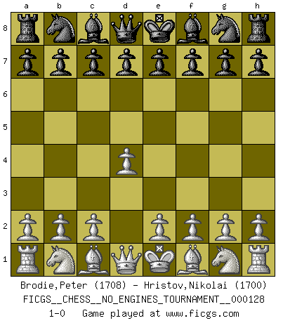 Last move : 1-0 2023 July 7 2:38:23 [Event "FICGS__CHESS__NO_ENGINES_TOURNAMENT__000128"] [Site "FICGS"] [Date "2023.05.27"] [Round "1"] [White "Brodie,Peter"] [Black "Hristov,Nikolai"] [Result "1-0"] [WhiteElo "1708"] [BlackElo "1700"] 1.d4 1-0 This chess game has been lost on time (started : 2023.05.27 18:43:7) Follow this game move after move (download)It is not enough to be a good player... you must also play well. (Siegbert Tarrasch) Sehr viele beherrschen heutzutage das große Einmalseins des Schachspiels und kennen sogar dessen Logarithmentafeln auswendig - deshalb sollte man hin und wieder zu beweisen trachten, dass zwei mal zwei auch fünf sein kann. (Mikhail Nekhemyevich Tal) El Ajedrez es el arte del análisis. (Mikhail Botvinnik) Le temps de noter son nom sur la feuille de partie, j'étais déjà en zeitnot ! D'un modeste amateur apparié lors de la première ronde d'un open contre le grand-maître Azmaïparashvili. Computers make it easier to do a lot of things, but most of the things they make it easier to do don't need to be done. (Andy Rooney)