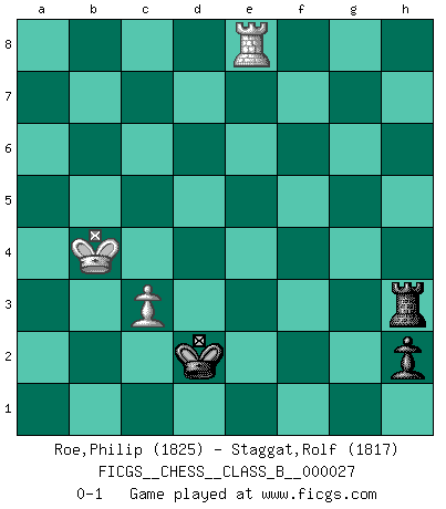 Last move : 0-1 2008 February 10 22:23:15 [Event "FICGS__CHESS__CLASS_B__000027"] [Site "FICGS"] [Date "2007.09.01"] [Round "1"] [White "Roe,Philip"] [Black "Staggat,Rolf"] [Result "0-1"] [WhiteElo "1825"] [BlackElo "1817"] 1.Nc3 c5 2.Nf3 Nc6 3.d4 cxd4 4.Nxd4 Nf6 5.Bg5 e6 6.Qd2 Be7 7.e4 Nxe4 8.Nxe4 Bxg5 9.Nxg5 Nxd4 10.Ne4 Nf5 11.g4 d5 12.gxf5 dxe4 13.Bb5+ Bd7 14.Bxd7+ Qxd7 15.Qxd7+ Kxd7 16.O-O-O Ke7 17.fxe6 fxe6 18.Rhg1 g6 19.Rg4 Rhf8 20.Rxe4 Rxf2 21.Red4 Rxh2 22.Rd7+ Kf6 23.Rf1+ Kg5 24.Rg1+ Kf4 25.Rf7+ Ke5 26.Rxb7 h5 27.Rxg6 Rc8 28.c3 Rf8 29.Rg1 R8f2 30.Rxa7 Rc2+ 31.Kd1 Rxb2 32.Kc1 h4 33.Re1+ Kf6 34.Rh7 Rxa2 35.Kb1 Rab2+ 36.Kc1 Rhc2+ 37.Kd1 Ra2 38.Rh6+ Kg7 39.Rhxe6 Rg2 40.Re7+ Kg6 41.R7e6+ Kg5 42.R6e5+ Kg4 43.R5e4+ Kg3 44.R1e3+ Kf2 45.Re2+ Rxe2 46.Rxe2+ Kf3 47.Re8 h3 48.Rf8+ Kg3 49.Rg8+ Kh2 50.Rh8 Rg3 51.Kc2 Kg2 52.Kb3 h2 53.Kb4 Rh3 54.Rg8+ Kf2 55.Rf8+ Ke2 56.Re8+ Kd2 0-1 Dunst (Sleipner, Heinrichsen) Opening Queenside Castling by player White (move 16) 10 pieces endgame at move 31 : White KRRPP , Black KRRPP WHITE : King + 2 Rooks 2 Pawns BLACK : King + 2 Rooks 2 Pawns 9 pieces endgame at move 34 : White KRRP , Black KRRPP WHITE : King + 2 Rooks 1 Pawn BLACK : King + 2 Rooks 2 Pawns 8 pieces endgame at move 39 : White KRRP , Black KRRP WHITE : King + 2 Rooks 1 Pawn BLACK : King + 2 Rooks 1 Pawn 7 pieces endgame at move 45 : White KRP , Black KRRP WHITE : King + 1 Rook 1 Pawn BLACK : King + 2 Rooks 1 Pawn 6 pieces endgame at move 46 : White KRP , Black KRP WHITE : King + 1 Rook 1 Pawn BLACK : King + 1 Rook 1 Pawn Player Black won this chess game. Follow this game move after move (download)First-class players lose to second class players because second-class players sometimes play a first-class game. (Tarrasch) Ich bin Weltmeister und muß mit niemandem irgend etwas diskutieren. (Viswanathan Anand) Por la belleza de sus partidas, la claridad de su juego y lo brillante de sus ideas, Fischer se creó el mismo como un artista de la misma estatura como Brahms, Rembrandt y Shakespeare. (David Levy) Il a essayé de se convaincre qu'il pourrait empêcher toutes les erreurs et ne jamais perdre. L'horreur ! Gary Kasparov au sujet de Robert Fischer. The only thing that matters is the evidence. (Horatio Caine, C.S.I. Miami)