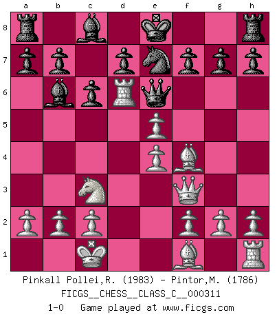 Last move : 1-0 2023 June 4 0:58:36 [Event "FICGS__CHESS__CLASS_C__000311"] [Site "FICGS"] [Date "2023.05.30"] [Round "1"] [White "Pinkall Pollei,Rich"] [Black "Pintor,Manuel"] [Result "1-0"] [WhiteElo "1983"] [BlackElo "1786"] 1.e4 e5 2.Nf3 Nc6 3.Nc3 Bc5 4.Nxe5 Nxe5 5.d4 Bb6 6.dxe5 Qe7 7.Bf4 c6 8.Qf3 Qe6 9.O-O-O Ne7 10.Rd6 1-0 Follow this game move after move (download)In life, as in Chess, one's own Pawns block one's way. A man's very wealth, ease, leisure, children, books, which should help him to win, more often checkmate him. (Charles Buxton) Ich habe Putins Aufstieg an die Macht beobachtet und seine Politik, die demokratischen Institutionen meines Landes zu zerstören. (Garry Kasparov) El Ajedrez es un mar en el cual un mosquito puede beber y un elefante puede bañarse. (Refrán Hindú) Je menace de comprendre la position. (Anonyme) Excelling at chess has long been considered a symbol of more general intelligence. That is an incorrect assumption in my view, as pleasant as it might be. But for the purposes of argument and investigation, chess is, in Russkin-Gutman's words, 'an unparalleled laboratory, since both the learning process and the degree of ability obtained can be objectified and quantified, providing an excellent comparative framework on which to use rigorous analytical techniques.' (The Chess Master and the Computer, by Garry Kasparov - 2010)