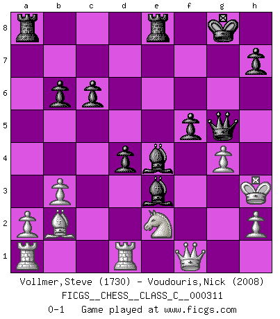 Last move : 0-1 2023 July 25 0:30:19 [Event "FICGS__CHESS__CLASS_C__000311"] [Site "FICGS"] [Date "2023.05.30"] [Round "1"] [White "Vollmer,Steve"] [Black "Voudouris,Nick"] [Result "0-1"] [WhiteElo "1730"] [BlackElo "2008"] 1.e4 Nf6 2.e5 Nd5 3.c4 Nb6 4.d4 d6 5.exd6 exd6 6.Nc3 Nc6 7.Be3 Be7 8.Bd3 O-O 9.Nge2 Nb4 10.O-O Nxd3 11.Qxd3 d5 12.b3 c6 13.c5 Nd7 14.Ng3 b6 15.cxb6 axb6 16.Rfc1 Ba3 17.Rd1 Re8 18.Nf5 Nf8 19.Bc1 g6 20.Ne3 Bd6 21.g3 Ne6 22.f4 Nxd4 23.Qxd4 Bc5 24.Qd3 Bf5 25.Qf1 Qf6 26.Bb2 Bxe3+ 27.Kg2 d4 28.Ne2 Be4+ 29.Kh3 g5 30.fxg5 Qxg5 31.g4 f5 0-1 Follow this game move after move (download)Chess teaches you to control the initial excitement you feel when you see something that looks good and it trains you to think objectively when you're in trouble. (Stanley Kubrick) Ich habe die Schachforschung dermaßen betrieben, dass sie auf eine wissenschaftliche Basis gestellt wurde. (Mikhail Moiseyevich Botvinik) Solo el jugador con la iniciativa tiene el derecho a atacar. (Wilhelm Steinitz) La menace est plus forte que l'exécution. (Aaron Nimzovitch) Unless in communicating with it one says exactly what one means, trouble is bound to result. (Alan Turing, about computers)