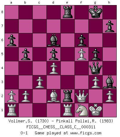 Last move : 0-1 2023 July 24 19:22:12 [Event "FICGS__CHESS__CLASS_C__000311"] [Site "FICGS"] [Date "2023.05.30"] [Round "1"] [White "Vollmer,Steve"] [Black "Pinkall Pollei,Rich"] [Result "0-1"] [WhiteElo "1730"] [BlackElo "1983"] 1.e4 e5 2.Nf3 Nc6 3.Bb5 a6 4.Ba4 Nf6 5.O-O Be7 6.Re1 b5 7.Bb3 O-O 8.c3 d5 9.exd5 Nxd5 10.Nxe5 Nxe5 11.Rxe5 c6 12.d4 Bd6 13.Re1 Qh4 14.g3 Qh3 15.Qf3 Bg4 16.Qg2 Qh5 17.Be3 Bf3 18.Qf1 Rae8 19.Nd2 Bg4 20.Bxd5 cxd5 21.f3 Bh3 22.Qf2 Re6 23.f4 f6 24.Rac1 Rfe8 25.Ra1 g5 26.f5 R6e7 27.Nf1 Qg4 28.Bd2 Re2 0-1 Follow this game move after move (download)Chess is a terrible game. If you have no center, your opponent has a freer position. If you do have a center, then you really have something to worry about ! (Siegbert Tarrasch) Modernes Schach erfordert enorme Anspannung. Es ist für einen normalen Menschen unmöglich das auszuhalten. (Viktor Kortschnoi) No volvere nunca a jugar contigo. Has insultado a mi amigo. - cuando un oponente se maldijo por una mala jugada (Miguel Najdorf) Demandez au pauvre Cg1 ce qu'il en pense. Eduard Gufeld à propos de la variante Saemisch de l'Est-Indienne. I believe in luck. How else can you explain the success of those you dislike ? (Jean Cocteau)