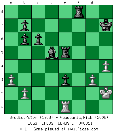 Last move : 0-1 2024 January 5 13:8:25 [Event "FICGS__CHESS__CLASS_C__000311"] [Site "FICGS"] [Date "2023.05.30"] [Round "1"] [White "Brodie,Peter"] [Black "Voudouris,Nick"] [Result "0-1"] [WhiteElo "1708"] [BlackElo "2008"] 1.Nf3 d5 2.d4 e6 3.c4 c6 4.Nc3 f5 5.e3 Bd6 6.c5 Bc7 7.Be2 Nf6 8.O-O O-O 9.g3 Nbd7 10.Ng5 Qe7 11.Bd2 h6 12.Nf3 g5 13.h3 e5 14.dxe5 Nxe5 15.Nxe5 Bxe5 16.f4 gxf4 17.exf4 Bc7 18.Re1 Qxc5+ 19.Kg2 Bb6 20.Rf1 d4 21.Na4 Qe7 22.Re1 Ne4 23.Bf3 Be6 24.Bxe4 fxe4 25.Qh5 Qh7 26.Bb4 Rfd8 27.Be7 Rd5 28.Bg5 e3 29.Re2 hxg5 30.Qxh7+ Kxh7 31.Nxb6 axb6 32.fxg5 Rxg5 33.h4 Bd5+ 34.Kh2 Re5 35.a3 d3 36.R2e1 d2 37.Rad1 dxe1Q 38.Rxe1 Rf8 0-1 Follow this game move after move (download)Chess is the art of analysis. (Mikhail Botvinnik) Wir irren allesamt, nur jeder irrt anders. (Georg Christoph Lichtenberg) Al jugar al Ajedrez entonces, podemos aprender: Primero: Previsión... Segundo: Prudencia... Tercero: Cautela... Y al final, aprendemos del Ajedrez el hábito de no ser desanimados por apariencias malas presentes en el estado de nuestros asuntos, el hábito de la esperanza por una oportunidad favorable y la perseveración de los secretos de los recursos. (Benjamin Franklin) La guerre est enfant de la passion, la passion est enfant du narcissisme et le narcissisme est l'enfant. (...) Une autre partie ? (Thibault de Vassal) There is no vagueness without wind. (Chinese proverb)