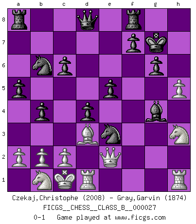 Last move : 0-1 2007 December 11 13:3:58 [Event "FICGS__CHESS__CLASS_B__000027"] [Site "FICGS"] [Date "2007.09.01"] [Round "1"] [White "Czekaj,Christophe"] [Black "Gray,Garvin"] [Result "0-1"] [WhiteElo "2008"] [BlackElo "1874"] 1.Nc3 g6 2.h4 Nf6 3.e4 d6 4.d4 Bg7 5.Be2 h5 6.Be3 c6 7.Qd2 b5 8.O-O-O b4 9.Nb1 a5 10.f3 Nbd7 11.Nh3 O-O 12.e5 Nd5 13.Bh6 dxe5 14.Bxg7 Kxg7 15.g4 hxg4 16.fxg4 exd4 17.h5 e5 18.Bc4 Ne3 19.Qe2 Nb6 20.Bd3 Bxg4 0-1 Comment by player 2 : Garvin Gray : lol h4 :) Dunst (Sleipner, Heinrichsen) Opening Queenside Castling by player White (move 8) Kingside Castling by player Black (move 11) Player Black won this chess game. Follow this game move after move (download)The combination player thinks forward; he starts from the given position, and tries the forceful moves in his mind. (Emanuel Lasker) Ich verachte die Medien. (Robert James Fischer) Existen dos clases de sacrificios: los correctos y los míos. (Mikhail Tal) La guerre est enfant de la passion, la passion est enfant du narcissisme et le narcissisme est l'enfant. (...) Une autre partie ? (Thibault de Vassal) Employ the attack like tactic of defense. (Chinese proverb)
