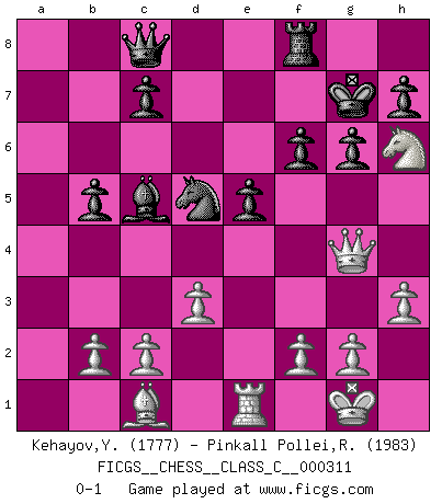 Last move : 0-1 2023 October 31 12:42:14 [Event "FICGS__CHESS__CLASS_C__000311"] [Site "FICGS"] [Date "2023.05.30"] [Round "1"] [White "Kehayov,Yulian"] [Black "Pinkall Pollei,Rich"] [Result "0-1"] [WhiteElo "1777"] [BlackElo "1983"] 1.e4 e5 2.Nf3 Nc6 3.Bb5 a6 4.Ba4 Nf6 5.O-O Be7 6.Re1 b5 7.Bb3 O-O 8.h3 Bb7 9.d3 d5 10.exd5 Nxd5 11.a4 Nd4 12.Nbd2 Nxb3 13.Nxb3 f6 14.Na5 Qc8 15.Nxb7 Qxb7 16.axb5 axb5 17.Rxa8 Qxa8 18.Nh4 Bc5 19.Qg4 Qc8 20.Nf5 g6 21.Nh6+ Kg7 0-1 Follow this game move after move (download)Any material change in a position must come about by mate, a capture, or a Pawn promotion. (Purdy) Ich würde die 30 stärksten Spieler der USA im Simultanspiel besiegen. (José Raúl Capablanca) Morphy probablemente fue el genio más grande de todos. (Bobby Fischer) Dans le domaine de la peinture, de la gravure et de la sculpture, dès la première décennie de notre siècle, les artistes abandonnent la représentation de la partie d'échecs pour se concentrer sur les pièces, sur les échiquiers et sur toutes les variations auxquelles les unes et les autres peuvent donner lieu. On passe en quelque sorte d'un thème social à un thème musical (au sens de la musica médiévale, c'est-à-dire d'une notion qui inclue le rythme, l'harmonie, la construction et la déconstruction, etc.). Graphiquement et picturalement, l'échiquier apparaît comme une structure ouverte, dynamique, d'une richesse infinie, autorisant toutes les combinatoires et débouchant sur des mouvements et des rythmes de nature exponentielle. (Michel Pastoureau) In God we trust, all others we virus scan. (Anonymous)