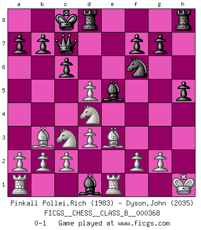 Last move : 0-1 2023 June 28 0:26:26 [Event "FICGS__CHESS__CLASS_B__000368"] [Site "FICGS"] [Date "2023.05.31"] [Round "1"] [White "Pinkall Pollei,Rich"] [Black "Dyson,John"] [Result "0-1"] [WhiteElo "1983"] [BlackElo "2035"] 1.e4 e5 2.Nf3 Nc6 3.Nc3 Nf6 4.Bb5 Nd4 5.Ba4 c6 6.Nxe5 d6 7.Nf3 Bg4 8.d3 d5 9.O-O Qa5 10.Bd2 O-O-O 11.Bb3 Qc7 12.Re1 h5 13.exd5 Bd6 14.Kh1 Bxh2 15.Be3 Be5 16.Nxd4 Bxd1 0-1 Follow this game move after move (download)You sit at the board and suddenly your heart leaps. Your hand trembles to pick up the piece and move it. But what Chess teaches you is that you must sit there calmly and think about whether it's really a good idea and whether there are other better ideas. (Stanley Kubrick) Schach ist ein schwarz-weisser Dschungel. (Garry Kasparov) Tu cuerpo tiene que estar en óptima condición. Tu Ajedrez se deteriora como lo hace tu cuerpo. No puedes separar la mente y el cuerpo. (Bobby Fischer) Les sacrifices démontrent seulement que quelqu'un a gaffé. (Savielly Tartacover) Rules and bones are meant to be broken. (Anonymous)
