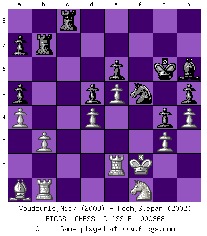 Last move : 0-1 2024 June 24 3:36:43 [Event "FICGS__CHESS__CLASS_B__000368"] [Site "FICGS"] [Date "2023.05.31"] [Round "1"] [White "Voudouris,Nick"] [Black "Pech,Stepan"] [Result "0-1"] [WhiteElo "2008"] [BlackElo "2002"] 1.d4 Nf6 2.f4 d5 3.e3 Bf5 4.Bd3 e6 5.Nf3 Be7 6.O-O O-O 7.Ne5 c5 8.c3 Nc6 9.Qe2 Rc8 10.b3 cxd4 11.exd4 Nxe5 12.fxe5 Bxd3 13.Qxd3 Ne4 14.Bb2 Qa5 15.Nd2 Nxc3 16.Rf3 Nb5 17.a4 Nc7 18.Bc3 Qa6 19.Qe3 Qb6 20.Raf1 Ne8 21.Qd3 f5 22.Rb1 g5 23.Bb2 g4 24.Rf2 Qa6 25.Qxa6 bxa6 26.Nf1 h5 27.g3 Ng7 28.Rc1 f4 29.Rxf4 Nf5 30.Rb1 Bg5 31.Rf2 Rf7 32.Ba1 Rfc7 33.h4 Bh6 34.Bb2 Rb7 35.Ba1 a5 36.Re2 Kh7 37.Kg2 Kg7 38.Kf2 Kg6 0-1 Follow this game move after move (download)The combination player thinks forward; he starts from the given position, and tries the forceful moves in his mind. (Emanuel Lasker) Konzentriere dich auf materielle Gewinne. Nimm, was dir dein Gegner gibt, ausser es gibt einen guten Grund der dagegenspricht. (Robert James Fischer) Existen dos clases de sacrificios: los correctos y los míos. (Mikhail Tal) L'attaque fait le spectacle, la défense gagne les matchs. (Dicton footballistique) Once you start thinking you have nothing left to learn, you have everything to learn. (Steve Badget)