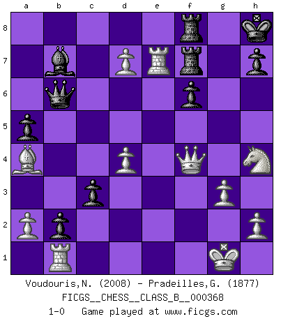 Last move : 1-0 2024 March 17 2:46:29 [Event "FICGS__CHESS__CLASS_B__000368"] [Site "FICGS"] [Date "2023.05.31"] [Round "1"] [White "Voudouris,Nick"] [Black "Pradeilles,Guillaume"] [Result "1-0"] [WhiteElo "2008"] [BlackElo "1877"] 1.d4 Nf6 2.f4 d5 3.e3 e6 4.Bd3 c5 5.c3 b6 6.Qe2 Bd6 7.Nf3 O-O 8.O-O Bb7 9.Ne5 Nc6 10.Nd2 Ne7 11.b3 Rc8 12.Bb2 Ne4 13.Nec4 Bb8 14.Rac1 b5 15.Ne5 Nxd2 16.Qxd2 c4 17.Bc2 f6 18.Nf3 Bd6 19.Qe2 a5 20.g3 b4 21.bxc4 dxc4 22.e4 Qb6 23.e5 bxc3 24.exd6 cxb2 25.Qxe6+ Rf7 26.Rb1 g6 27.Ba4 Nd5 28.f5 gxf5 29.Nh4 Nc7 30.Qe3 f4 31.Qxf4 Nd5 32.Qg4+ Kh8 33.d7 Rcf8 34.Rfe1 Ne7 35.Qf4 c3 36.Rxe7 1-0 Follow this game move after move (download)Chess is above all, a fight ! (Emanuel Lasker) Glücklicherweise sind Großmeister Ruben Fines reine Schachbücher weniger phallozentrisch [als seine Schachpsychologie] und deswegen auch weniger lächerlich. (Nigel Short) Si yo gano un torneo, yo lo gano por mí mismo. Yo hago las jugadas. Nadie me ayuda. (Bobby Fischer) Les Echecs représentent une sphère d'idées créatrices basée sur la volonté des deux protagonistes. (Smyslov) Never risk one's whole fortune unless supported by one's entire army. (Niccolo Machiavelli)