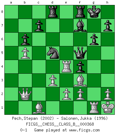 Last move : 0-1 2023 October 13 5:17:12 [Event "FICGS__CHESS__CLASS_B__000368"] [Site "FICGS"] [Date "2023.05.31"] [Round "1"] [White "Pech,Stepan"] [Black "Salonen,Jukka"] [Result "0-1"] [WhiteElo "2002"] [BlackElo "1996"] 1.c4 Nf6 2.g3 e5 3.Bg2 d5 4.cxd5 Nxd5 5.Nc3 Nb6 6.Nf3 Nc6 7.O-O Be7 8.d3 O-O 9.a3 Be6 10.Be3 f5 11.Rc1 f4 12.Bd2 Qe8 13.Ne4 a6 14.b4 Qh5 15.a4 Nd5 16.b5 axb5 17.axb5 Nd4 18.gxf4 Nxf3+ 19.Bxf3 Qg6+ 20.Kh1 exf4 21.Rg1 Qf5 22.Nc5 Bxc5 23.Rxc5 g6 24.Qc2 Bf7 25.Qb2 b6 26.Rc4 Rad8 27.Bc1 Rfe8 28.Re4 Rf8 0-1 This chess game has been lost on time (started : 2023.05.31 10:25:28) Follow this game move after move (download)Chess is not like life... it has rules ! (Mark Pasternak) Capablanka war das größte Genie der Schachgeschichte! Aber denken sie nicht er habe nichts vom Schach verstanden. Er wusste nur soviel wie er wissen musste um seine Ziele zu erreichen. (Mikhail Moiseyevich Botvinik) ¿Cual es el objetivo de jugar una apertura de gambito?... Para adquirir una reputación de ser un jugador apuesto a costo de perder el juego. (Siegbert Tarrasch) Un footballeur joue avec ses pieds, parfois avec sa tête. Un joueur d'échecs ne joue qu'avec sa tête. Et quand il ne joue plus, il meurt. (Jacob Murray) Better than a thousand days of diligent study is one day with a great teacher. (Japanese proverb)