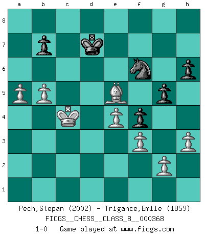 Last move : 1-0 2024 April 17 21:43:34 [Event "FICGS__CHESS__CLASS_B__000368"] [Site "FICGS"] [Date "2023.05.31"] [Round "1"] [White "Pech,Stepan"] [Black "Trigance,Emile"] [Result "1-0"] [WhiteElo "2002"] [BlackElo "1859"] 1.d4 Nf6 2.c4 g6 3.Nc3 Bg7 4.e4 d6 5.Nf3 O-O 6.Be2 e5 7.dxe5 dxe5 8.Qxd8 Rxd8 9.Bg5 Re8 10.Nd5 Nxd5 11.cxd5 c6 12.Bc4 cxd5 13.Bxd5 Na6 14.O-O-O Nb4 15.Bb3 Bg4 16.h3 Be6 17.Bxe6 Rxe6 18.a3 Nc6 19.Rd7 h6 20.Be3 Rc8 21.Kb1 Re7 22.Rxe7 Nxe7 23.Bxa7 Nc6 24.Be3 Rd8 25.Kc2 f5 26.Rd1 Kf7 27.Rxd8 Nxd8 28.a4 Nc6 29.Kb3 f4 30.Bb6 g5 31.Kc4 Ke6 32.b4 Nb8 33.Ne1 Bf8 34.a5 Nd7 35.Bc7 Be7 36.f3 Nf6 37.Nd3 Bd6 38.Nc5+ Bxc5 39.Kxc5 Nd7+ 40.Kc4 Nf6 41.b5 Kd7 42.Bxe5 1-0 Follow this game move after move (download)Chess, like love, is infectious at any age. (Flohr) Sie bekommen vielleicht den Eindruck, dass die Spitzenspieler überhaupt gar nicht so stark sind. Aber das stimmt nicht. Es ist eine Illusion. Mit einem Computer an der Seite ist es sehr leicht, Urteile zu fällen, aber wenn man alleine am Brett sitzt, sieht die Sache ganz anders aus. (Vladimir Kramnik) El Ajedrez es despiadado: debes de estar preparado para matar gente. (Nigel Short) 'L'échange des dames est un coup dur pour les deux adversaires...' Un journaliste lors d'une partie du match Spassky-Fischer SEO proverb : Make your website optimized for human beings, not for search engines.