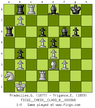 Last move : 1-0 2023 December 10 11:15:28 [Event "FICGS__CHESS__CLASS_B__000368"] [Site "FICGS"] [Date "2023.05.31"] [Round "1"] [White "Pradeilles,Guillaume"] [Black "Trigance,Emile"] [Result "1-0"] [WhiteElo "1877"] [BlackElo "1859"] 1.c4 Nf6 2.d4 g6 3.Nc3 Bg7 4.e4 d6 5.f3 O-O 6.Be3 e5 7.Nge2 c6 8.Qb3 Qc7 9.d5 Nbd7 10.a4 a5 11.O-O-O Nb8 12.h4 Na6 13.h5 Nd7 14.Qa3 b5 15.cxb5 cxb5 16.axb5 Nb4 17.Kb1 Nb6 18.Nc1 Nc4 19.Bxc4 Qxc4 20.g4 Bd7 21.b6 Rfb8 22.Rd2 Be8 23.hxg6 hxg6 24.g5 f6 25.gxf6 Bxf6 26.N1a2 Bg7 27.b3 Qa6 28.Nxb4 axb4 29.Qxa6 Rxa6 30.Na2 Rba8 31.Rc1 Bf6 32.b7 Rb8 33.Rc8 1-0 Follow this game move after move (download)There are two classes of men; those who are content to yield to circumstances and who play whist; those who aim to control circumstances, and who play Chess. (Mortimer Collins) Was ist der Unterschied zwischen einem Strassenarbeiter und einem Schachspieler? --Der Schachspieler bewegt sich ab und zu. (Anonymous) Una de estas pequeñas movidas modestas pudieran ser mas molestas a tu oponente que la amenaza mas grande. (Siegbert Tarrasch) Ce n'est pas pour s'amuser qu'il joue aux échecs : il célèbre un culte. (Vladimir Nabokov) The greatest con, that he ever pulled... was making you believe... that he is you. (Revolver, movie)