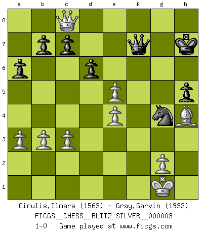 Last move : 1-0 2007 September 1 8:12:50 [Event "FICGS__CHESS__BLITZ_SILVER__000003"] [Site "FICGS"] [Date "2007.09.01"] [Round "1"] [White "Cirulis,Ilmars"] [Black "Gray,Garvin"] [Result "1-0"] [WhiteElo "1563"] [BlackElo "1932"] 1.e4 e5 2.Nc3 Nc6 3.Bc4 Bc5 4.Qg4 g6 5.Qg3 d6 6.Nf3 Be6 7.Bxe6 fxe6 8.d3 Nf6 9.Bg5 a6 10.O-O O-O 11.Qh4 Nb4 12.Rac1 Qe7 13.a3 Nc6 14.Nd1 Nd4 15.Nxd4 Bxd4 16.c3 Ba7 17.Ne3 h5 18.Bh6 Rf7 19.h3 Nh7 20.Qg3 g5 21.h4 Bxe3 22.Qxe3 gxh4 23.Qe2 Nf6 24.f4 Ng4 25.Bg5 Qd7 26.fxe5 Raf8 27.Bxh4 Nxe5 28.d4 Rxf1+ 29.Rxf1 Rxf1+ 30.Qxf1 Ng4 31.Qf4 Qg7 32.b3 e5 33.Qf5 Qf7 34.Qc8+ Kh7 35.dxe5 1-0 This chess game has been lost on time (started : 2007.09.01 4:1:46) Vienna game, Max Lange defense Kingside Castling by player White (move 10) Kingside Castling by player Black (move 10) Player White won this chess game. Follow this game move after move (download)There is only one thing Fischer does in Chess without pleasure: to lose ! (Boris Spassky) Jeder weiß, dass Gasprom Putins persönliches Machtinstrument ist. Die Firma wird vom Kreml aus geleitet und wird schon deshalb nie transparent sein. (Garry Kasparov) Los finales de Peón son del Ajedrez lo que el cesped es del Golf. (Cecil Purdy) Lorsque vous vous retrouvez devant une position atroce, ne tendez pas un ultime piège dérisoire avec l'intention d'abandonner si l'adversaire le déjoue ! Faites-vous plutôt un devoir de résister comme si votre vie en dépendait. Jouez le coup qui vous déplairait au centuple si vous étiez dans la peau de votre tortionnaire ! It's not a bug - it's an undocumented feature. (Anonymous)
