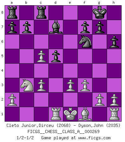 Last move : 1/2-1/2 2023 June 11 1:29:51 [Event "FICGS__CHESS__CLASS_A__000269"] [Site "FICGS"] [Date "2023.05.31"] [Round "1"] [White "Cleto Junior,Dirceu"] [Black "Dyson,John"] [Result "1/2-1/2"] [WhiteElo "2068"] [BlackElo "2035"] 1.d4 Nf6 2.c4 e6 3.Nf3 d5 4.Nc3 Bb4 5.Bg5 h6 6.Bxf6 Qxf6 7.Qb3 c5 8.cxd5 exd5 9.e3 O-O 10.dxc5 Bxc3+ 11.Qxc3 Qxc3+ 12.bxc3 Nd7 13.Rd1 Nf6 14.Nd4 Bd7 15.f3 Rfc8 16.Nb3 1/2-1/2 Follow this game move after move (download)Some part of a mistake is always correct. (Savielly Tartakover) Jede Eröffnung ist gut genug um gespielt zu werden, wenn nur ihr Ruf schlecht genug ist. (Savielly Grigorievitsch Tartakower) El Ajedrez es sobre todo, ¡una pelea!. (Emanuel Lasker) RxDa4 pat (...) Wisdom doesn't necessarily come with age. Sometimes age just shows up all by itself. (Tom Wilson)