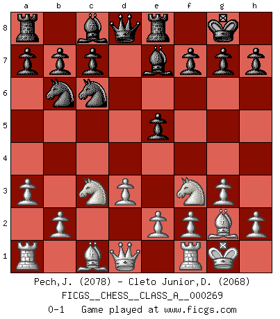 Last move : 0-1 2023 July 14 1:41:13 [Event "FICGS__CHESS__CLASS_A__000269"] [Site "FICGS"] [Date "2023.05.31"] [Round "1"] [White "Pech,Jaroslav"] [Black "Cleto Junior,Dirceu"] [Result "0-1"] [WhiteElo "2078"] [BlackElo "2068"] 1.c4 e5 2.Nc3 Nf6 3.Nf3 Nc6 4.g3 d5 5.cxd5 Nxd5 6.Bg2 Nb6 7.O-O Be7 8.d3 O-O 9.a3 Re8 0-1 This chess game has been lost on time (started : 2023.05.31 20:38:17) Follow this game move after move (download)The tactician knows what to do when there is something to do; whereas the strategian knows what to do when there is nothing to do. (Gerald Abrahams) Der Bart als Geschlechtszeichen mitten im Gesicht ist obszön. Daher gefällt er den Weibern. [Zugegeben, kein Schachzitat, aber unglaublich originell] (Arthur Schopenhauer) La táctica fluye a partir de una posición superior. (Bobby Fischer) Les Echecs ont trois composantes : le temps, l'espace et le matériel en dernier. (Mikhail Tal) Remember : Your focus determines your reality. (Qui-Gon Jinn in Star Wars ep.1)