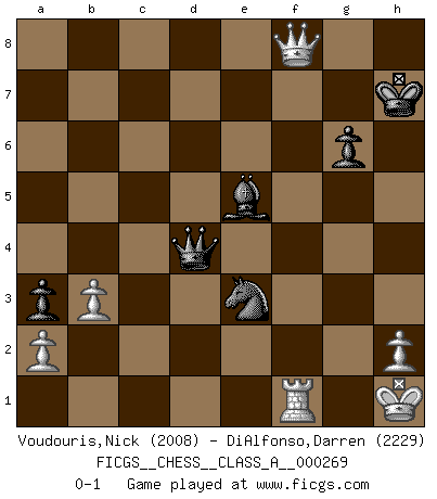 Last move : 0-1 2023 October 20 11:2:48 [Event "FICGS__CHESS__CLASS_A__000269"] [Site "FICGS"] [Date "2023.05.31"] [Round "1"] [White "Voudouris,Nick"] [Black "DiAlfonso,Darren"] [Result "0-1"] [WhiteElo "2008"] [BlackElo "2229"] 1.d4 Nf6 2.f4 d5 3.e3 Bf5 4.Bd3 e6 5.Nf3 a6 6.O-O c5 7.c3 Be7 8.b3 Nc6 9.Bb2 O-O 10.Ne5 Qb6 11.Qe2 Bxd3 12.Qxd3 a5 13.Nd2 a4 14.c4 Rfd8 15.Kh1 cxd4 16.exd4 Ne4 17.Nxe4 dxe4 18.Qxe4 Nxd4 19.Rfd1 Nf5 20.g4 Qe3 21.Qxb7 Nh4 22.Re1 Qf2 23.Bd4 Rxd4 24.Qxa8+ Rd8 25.Qc6 h6 26.Rf1 Qd2 27.Rae1 Qb2 28.Re3 Bc5 29.Nxf7 Rd5 30.Rg1 Bxe3 31.Qe8+ Kh7 32.cxd5 Bxf4 33.Ng5+ Bxg5 34.Qxe6 Qc2 35.Qe1 g6 36.Qb4 Bf6 37.Qb7+ Bg7 38.d6 Qe2 39.Rg3 Qd1+ 40.Rg1 Qxd6 41.Qe4 a3 42.g5 Nf5 43.gxh6 Be5 44.Qb7+ Kxh6 45.Qg2 Bd4 46.Re1 Qf4 47.Rf1 Qh4 48.Qd2+ Be3 49.Qg2 Bc5 50.Qf3 Bd6 51.Qf2 Qe4+ 52.Qf3 Qd4 53.Qf2 Ne3 54.Qf6 Be5 55.Qf8+ Kh7 0-1 Follow this game move after move (download)In Fischer's hands, a slight theoretical advantage is as good a being a Queen ahead. (Isaac Kashdan) Ich kenne keine einzige Person, die behaupten würde, Garri Kasparow sei ein guter Mensch (Nigel Short) Hay jugadores fuertes y personas amables y yo soy un jugador fuerte. (Bobby Fischer) Il vaut toujours mieux jouer un plan faux de façon logique que de n'avoir pas de plan du tout. (Victor Kortchnoï) The absolute truth is the thing that makes people laugh. (Carl Reiner)