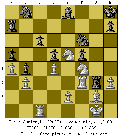 Last move : 1/2-1/2 2023 August 18 23:26:16 [Event "FICGS__CHESS__CLASS_A__000269"] [Site "FICGS"] [Date "2023.05.31"] [Round "1"] [White "Cleto Junior,Dirceu"] [Black "Voudouris,Nick"] [Result "1/2-1/2"] [WhiteElo "2068"] [BlackElo "2008"] 1.d4 d5 2.c4 e6 3.g3 c6 4.Bg2 f5 5.Nh3 Bd6 6.O-O Nf6 7.Qc2 O-O 8.Bf4 Qe7 9.Bxd6 Qxd6 10.Nd2 Bd7 11.Nf4 Qe7 12.Qb3 b5 13.Rac1 Kh8 14.cxd5 exd5 15.Qe3 Qxe3 16.fxe3 Re8 17.Nf3 Ng4 18.Rfe1 a5 19.b3 Rxe3 20.h3 Nf6 21.Ne5 g5 22.Nf7+ Kg7 23.Nxg5 Rxg3 24.Nf3 Kh8 25.Ne5 Be8 26.Rf1 Ra7 27.a4 b4 28.Rf3 1/2-1/2 Follow this game move after move (download)When in doubt... play Chess ! (Tevis) Gewinnen beim Schach fördert das Selbstvertrauen. Beim Sex spüre ich sowas nicht... (Garry Kasparov) a manera como él juega al Ajedrez, demuestra la completa naturaleza de un hombre. (Stanley Ellin) Je fais ceci parce que dans cinquante coups j'obtiendrai cela; je m'appelle Mikhail Moisevitch Botvinnik. (Botvinnik) The meaning of life is that it is to be lived, and it is not to be traded and conceptualized and squeezed into a pattern of systems. (Bruce Lee)