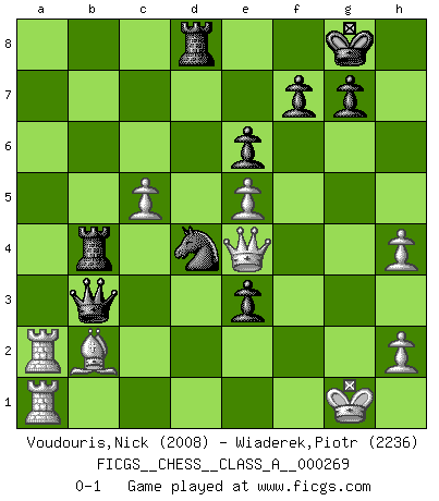 Last move : 0-1 2024 January 25 13:11:42 [Event "FICGS__CHESS__CLASS_A__000269"] [Site "FICGS"] [Date "2023.05.31"] [Round "1"] [White "Voudouris,Nick"] [Black "Wiaderek,Piotr"] [Result "0-1"] [WhiteElo "2008"] [BlackElo "2236"] 1.d4 Nf6 2.f4 d5 3.e3 Bf5 4.Bd3 e6 5.Nf3 c5 6.c3 Bd6 7.O-O Nc6 8.Ne5 Qb6 9.Kh1 O-O 10.b3 Rfd8 11.Bb2 Ne7 12.Nd2 Bxd3 13.Nxd3 Nf5 14.Qf3 h5 15.a4 Rac8 16.a5 Qc6 17.Ne5 Qa6 18.Rfe1 b5 19.axb6 Qxb6 20.Qe2 a5 21.Ra2 Bxe5 22.fxe5 Ne4 23.Nxe4 dxe4 24.Ra3 h4 25.Rea1 h3 26.gxh3 Rb8 27.Kg1 cxd4 28.exd4 e3 29.Qg2 Rd5 30.c4 Rd7 31.c5 Qb4 32.Rxa5 Qxb3 33.R5a2 R7d8 34.Qe4 Rb4 35.h4 Nxd4 0-1 Follow this game move after move (download)If your opponent offers you a draw, try to work out why he thinks he's worse off. (Nigel Short) Schach ist ein Teil der Kultur, und wenn es mit der Kultur abwärts geht, geht es auch mit dem Schach abwärts. (Mikhail Moiseyevich Botvinik) La vida es como el Ajedrez, con lucha, competición y eventos buenos y malos. (Benjamin Franklin) Les échecs, c'est l'imagination. (David Bronstein) If computers get too powerful, we can organize them into committees. That'll do them in. (Anonymous)