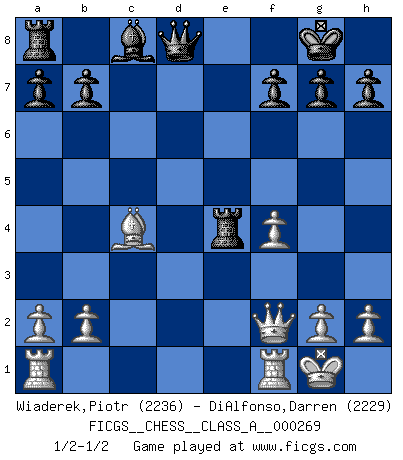 Last move : 1/2-1/2 2023 July 13 20:57:1 [Event "FICGS__CHESS__CLASS_A__000269"] [Site "FICGS"] [Date "2023.05.31"] [Round "1"] [White "Wiaderek,Piotr"] [Black "DiAlfonso,Darren"] [Result "1/2-1/2"] [WhiteElo "2236"] [BlackElo "2229"] 1.d4 Nf6 2.c4 e6 3.Nf3 d5 4.Nc3 Bb4 5.Qa4+ Nc6 6.e3 O-O 7.Bd2 dxc4 8.Bxc4 Bd6 9.Qc2 e5 10.dxe5 Nxe5 11.Nxe5 Bxe5 12.f4 Bxc3 13.Bxc3 Ng4 14.Bd4 c5 15.Bxc5 Re8 16.O-O Nxe3 17.Bxe3 Rxe3 18.Qf2 Re4 1/2-1/2 Follow this game move after move (download)No one ever won a game by resigning. (Unknown) Es ist nicht das erste mal, dass sich die FIDE dem Arabischen Geld gebeugt hat (über die FIDE WM 2004 in Lybien). (Larry Evans) Por la belleza de sus partidas, la claridad de su juego y lo brillante de sus ideas, Fischer se creó el mismo como un artista de la misma estatura como Brahms, Rembrandt y Shakespeare. (David Levy) Soyez une menace à chaque fois que vous vous asseyez pour jouer. (Ken Smith) You cannot beat a roulette table unless you steal money from it. (Albert Einstein)