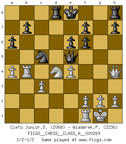 Last move : 1/2-1/2 2023 July 15 20:51:41 [Event "FICGS__CHESS__CLASS_A__000269"] [Site "FICGS"] [Date "2023.05.31"] [Round "1"] [White "Cleto Junior,Dirceu"] [Black "Wiaderek,Piotr"] [Result "1/2-1/2"] [WhiteElo "2068"] [BlackElo "2236"] 1.d4 Nf6 2.c4 e6 3.Nf3 d5 4.Nc3 Bb4 5.Bg5 dxc4 6.e4 c5 7.Bxc4 cxd4 8.Nxd4 Bxc3+ 9.bxc3 Qa5 10.Bb5+ Bd7 11.Bxf6 gxf6 12.Bxd7+ Nxd7 13.O-O a6 14.Rb1 Qc7 15.Qh5 Nc5 16.Rb4 Qe5 17.Qh4 Rd8 18.a4 1/2-1/2 Follow this game move after move (download)I have added these principles to the law: get the Knights into action before both Bishops are developed. (Emanuel Lasker) Im Schach gewinnt jeder. Hat man Freunde am Spiel - und das ist die Hauptsache - ist auch der Verlust einer Partie kein Unglück. (David Bronstein) El jugador de combinación piensa hacia adelante; comienza de la posición dada y trabaja las movidas contundentes en su mente. (Emanuel Lasker) Comme les marins qui ont mille raisons différentes d'aller en mer, les joueurs d'échecs en ont tout autant avant de s'installer devant une table et jouer... (Vincent Bertignac, philosophe) Art is the triumph over chaos. (John Cheever)