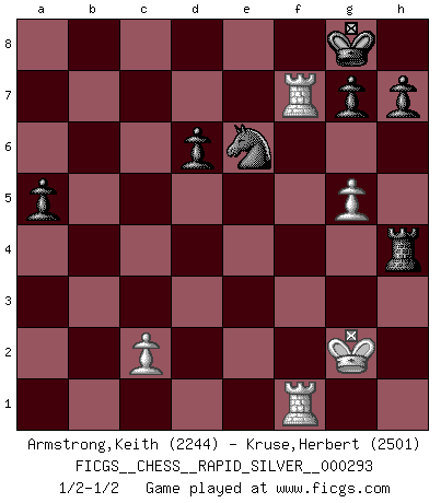 Last move : 1/2-1/2 2023 August 19 0:8:40 [Event "FICGS__CHESS__RAPID_SILVER__000293"] [Site "FICGS"] [Date "2023.06.01"] [Round "2"] [White "Armstrong,Keith"] [Black "Kruse,Herbert"] [Result "1/2-1/2"] [WhiteElo "2244"] [BlackElo "2501"] 1.Nf3 c5 2.e4 d6 3.d4 cxd4 4.Nxd4 Nf6 5.Nc3 a6 6.Bg5 Nbd7 7.Bc4 Qb6 8.Bb3 e6 9.f3 Be7 10.Qd2 Nc5 11.h4 Qc7 12.g4 b5 13.a3 Rb8 14.Be3 Nfd7 15.Bg5 Nf6 16.Ba2 b4 17.axb4 Rxb4 18.Bxf6 Bxf6 19.Nd5 exd5 20.Qxb4 dxe4 21.g5 Be5 22.f4 Bxf4 23.O-O Be3+ 24.Kh1 O-O 25.Rae1 Bxd4 26.Qxd4 a5 27.Rd1 Be6 28.Bxe6 Nxe6 29.Qxe4 Rb8 30.Rd2 Rxb2 31.Rdf2 Qb7 32.Qg2 Rb4 33.Rxf7 Rxh4+ 34.Kg1 Qxg2+ 35.Kxg2 Rg4+ 36.Kh1 Rh4+ 37.Kg2 Rg4+ 38.Kh1 Rh4+ 39.Kg2 1/2-1/2 Follow this game move after move (download)Chess is a beautiful mistress. (Bent Larsen) Wenn Schach ein enormer Dschungel ist, der seine Myriaden von Geheimnissen nicht preisgeben will, dann sind Computer die Kettensägen einer gewaltigen ökologisch unsensiblen Nutzholzfirma. (Nigel Short) ¿Que sería del Ajedrez sin errores graciosos?. (Kurt Richter) Fischer est le meilleur joueur du monde et Karpov n'est qu'un joueur de bistrot. (Garry Kasparov, agé de 16 ans) There is a great deal of difference between an eager man who wants to read a book and a tired man who wants a book to read. (G.K. Chesterton)