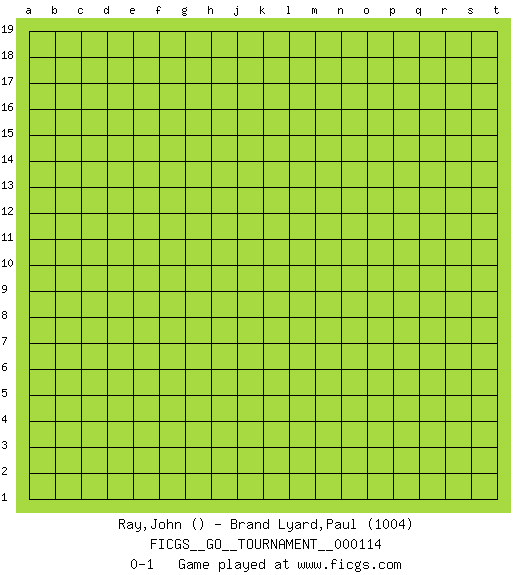 Last move : 0-1 2023 July 1 23:44:0 [Event "FICGS__GO__TOURNAMENT__000114"] [Site "FICGS"] [Date "2023.06.01"] [Round "1"] [Black "Ray,John"] [White "Brand Lyard,Paul"] [Result "0-1"] [Rating 2 "1004"] 0-1 This go game has been lost on time (started : 2023.06.01 19:55:45) Follow this game move after move (download)Against three in a row, play right in the center. (Anonymous) However beautiful the strategy, you should occasionally look at the results. (Winston Churchill)